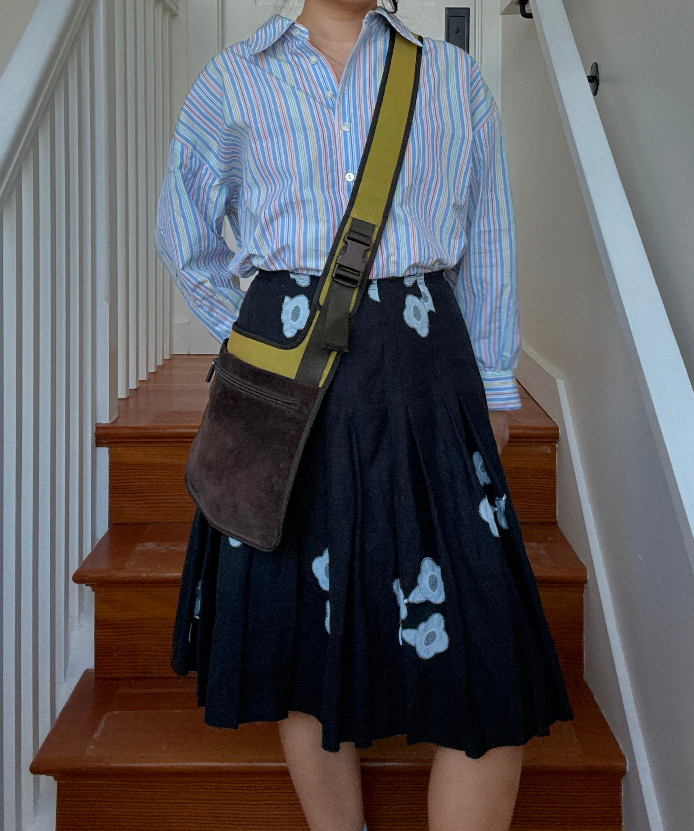 Here, I decided to play up pale blue flowers in the skirt with striped button-down in a similar shade. Stripes really are so freaking versatile, aren’t they?