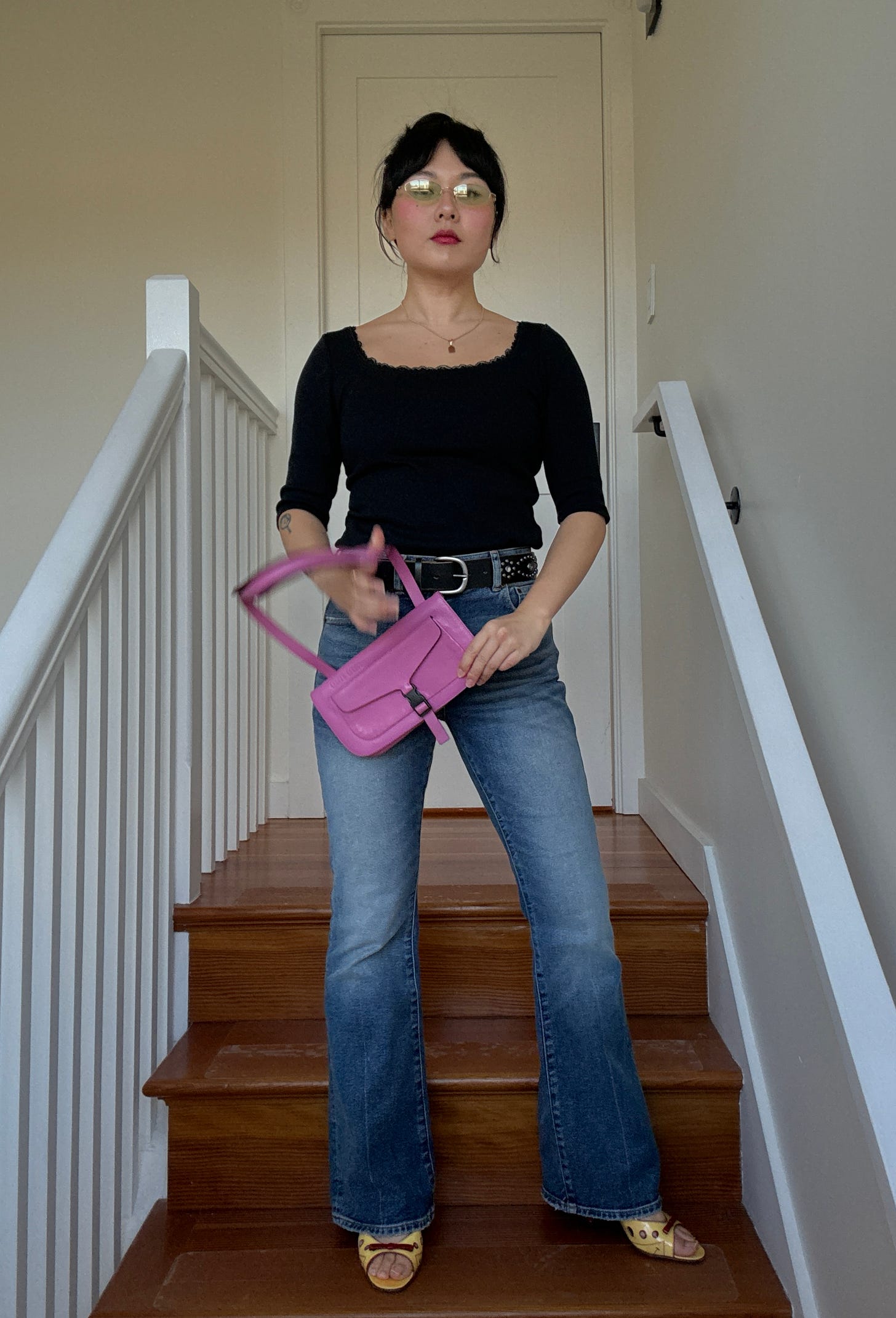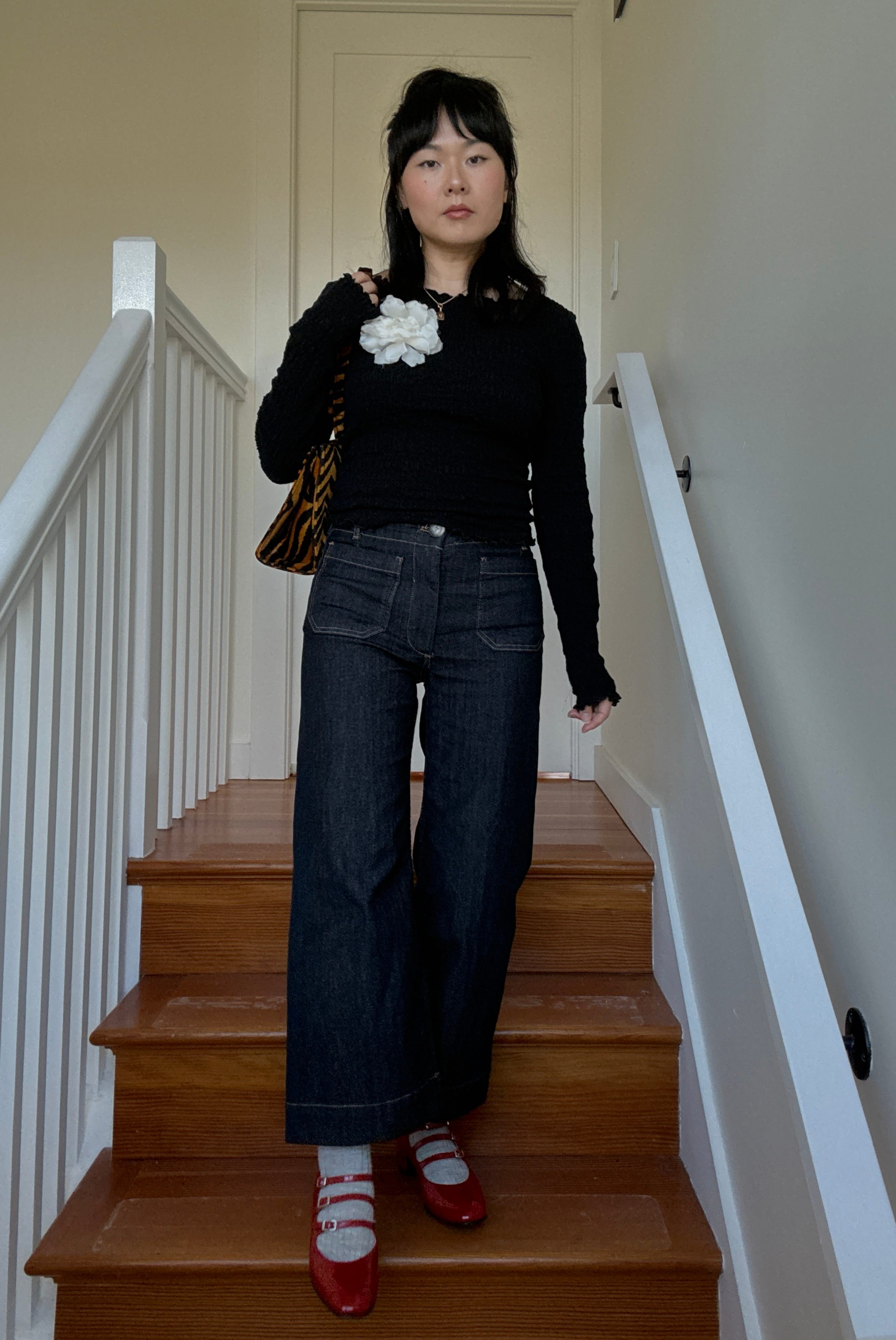 I want to lean into more y2k silhouettes with my basics, like cotton tops and jeans. For example, instead of a standard crew neck long sleeve top, I’ll try a more open neckline top with 3/4 sleeves (opens up opportunities for armwarmer layering too). And ever since I got these slightly flared jeans last November-ish, I’ve actually been wearing them a lot.