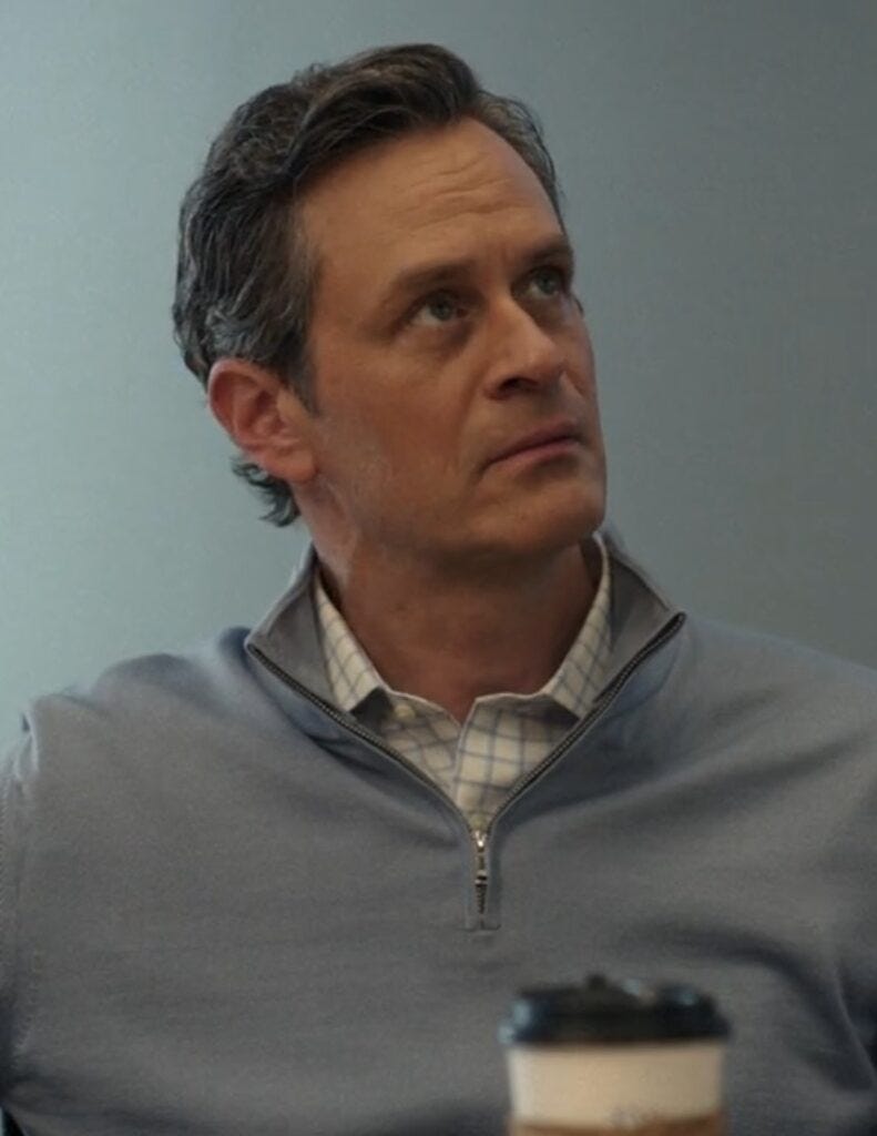 This specific combo of the check shirt with the quarter-zip pullover is also very finance guy. Adam comes across as “big fish in a small pond” to me. He chases wealth and status, but doesn’t seem very smart and could neverrrrrr keep up at a place like Pierpoint in Industry. Harper Stern would destroy him in a day.