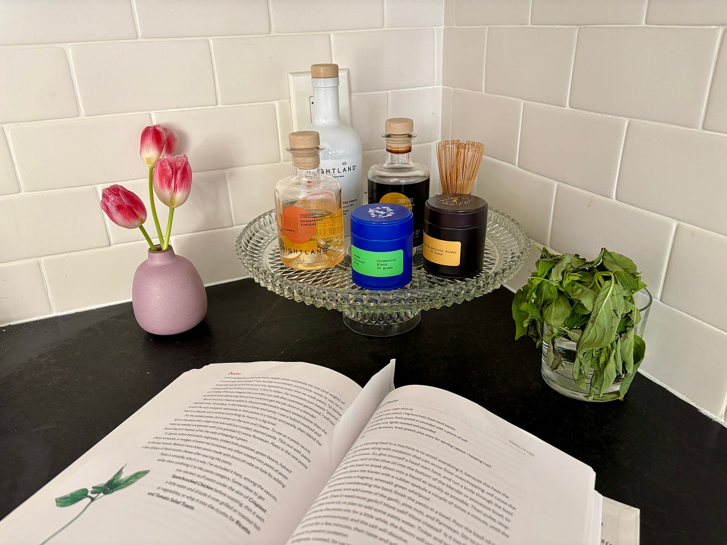 So, I flip through my trustiest cookbooks—Salt Fat Acid Heat is a classic—and bookmark recipes that are (1) realistic for my energy level and (2) reliably delicious. Lately, that has been pesto from scratch with canned chickpeas and a store-bought rotisserie chicken. My pesto is made with Brightland olive oil and a LOT of raw garlic.