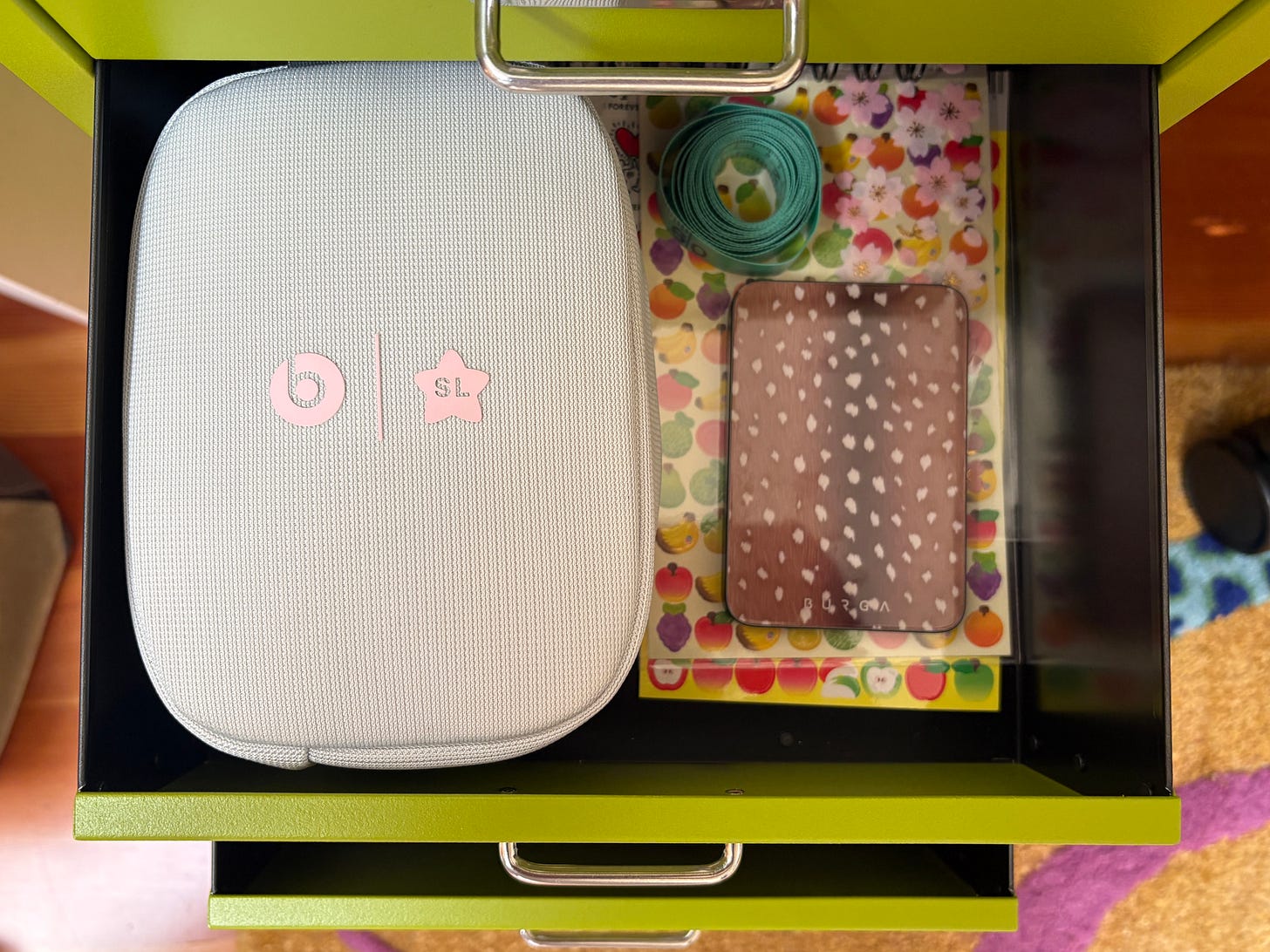 It is a constant struggle to keep my desk clear. At any given time it’s strewn with hair ties, lip glosses, receipts, post-it notes with newsletter ideas, color pencils, and 1099 forms (the bane of tax season). Last winter, I ordered two green Bisley under-desk storage cabinets, plus a smaller yellow desk cabinet (this model is 25% off rn), and they’ve been an organization lifesaver. Perfect if you have a lot of crafting stuff or collect paper ephemera like me.