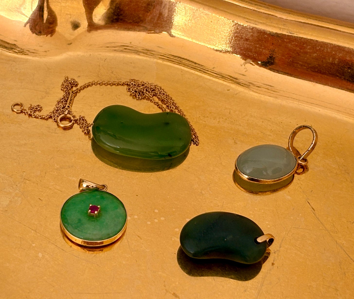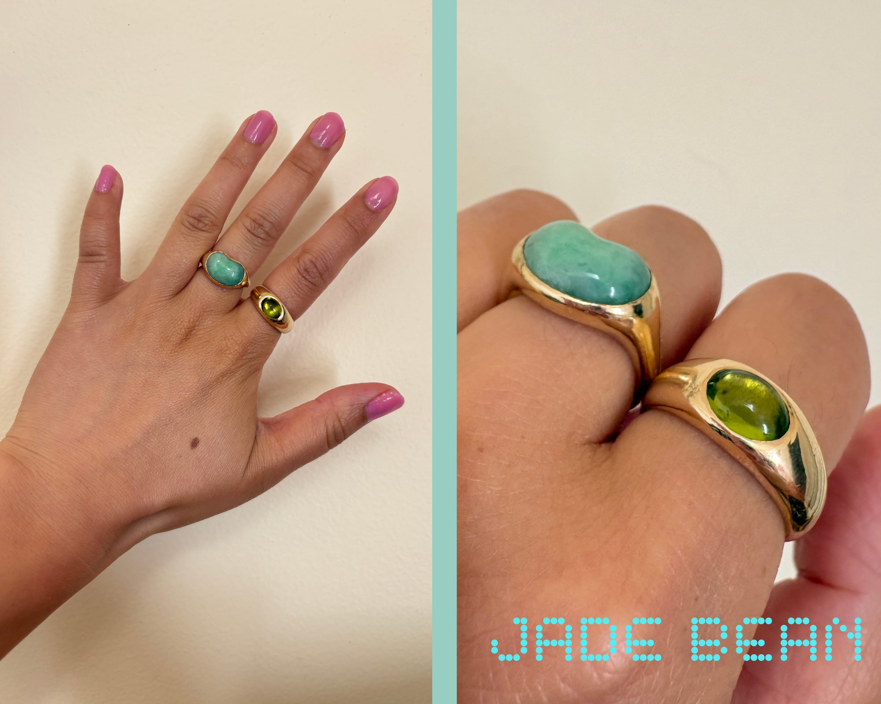 The jade jellybean was my first bespoke piece from Emilie! These are my most cherished and personal pieces, and I think you can tell up close that they were made by the same person. I’m also giddy over how the celadon jade color looks against the murky apple green in this lighting.