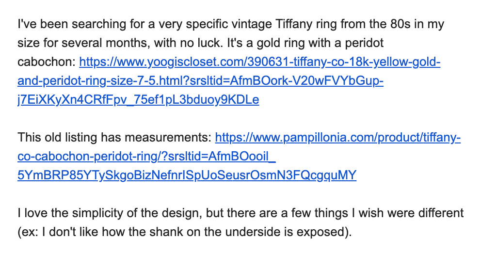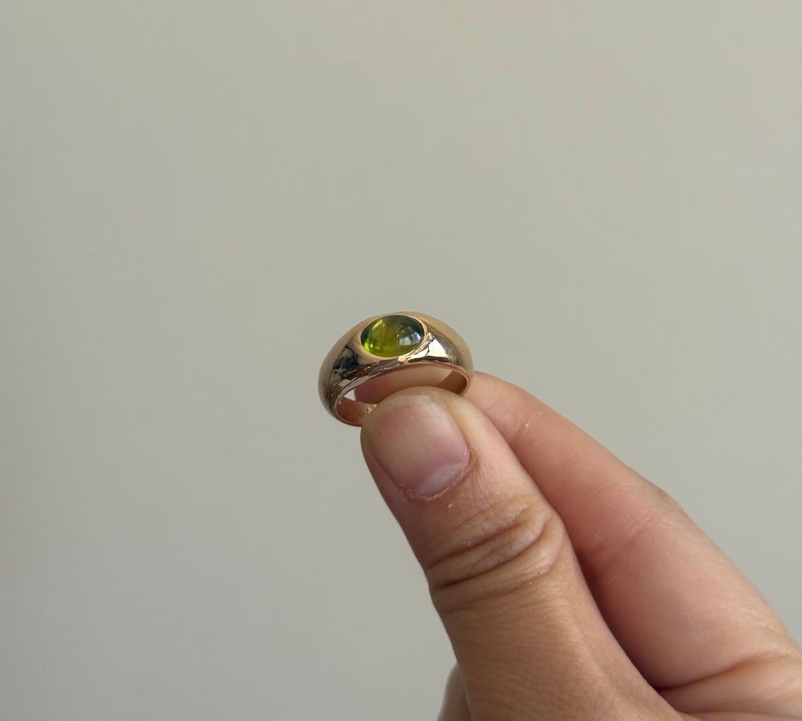 “But I loved that peridot pendant you sent on Instagram. Actually, I have a bespoke peridot cabochon ring in progress from Emilie (softgoodstudio), and I am SUPER excited about it.” Cecilia understands my jewelry taste so well and we’re both obsessed with peridot cabochons.