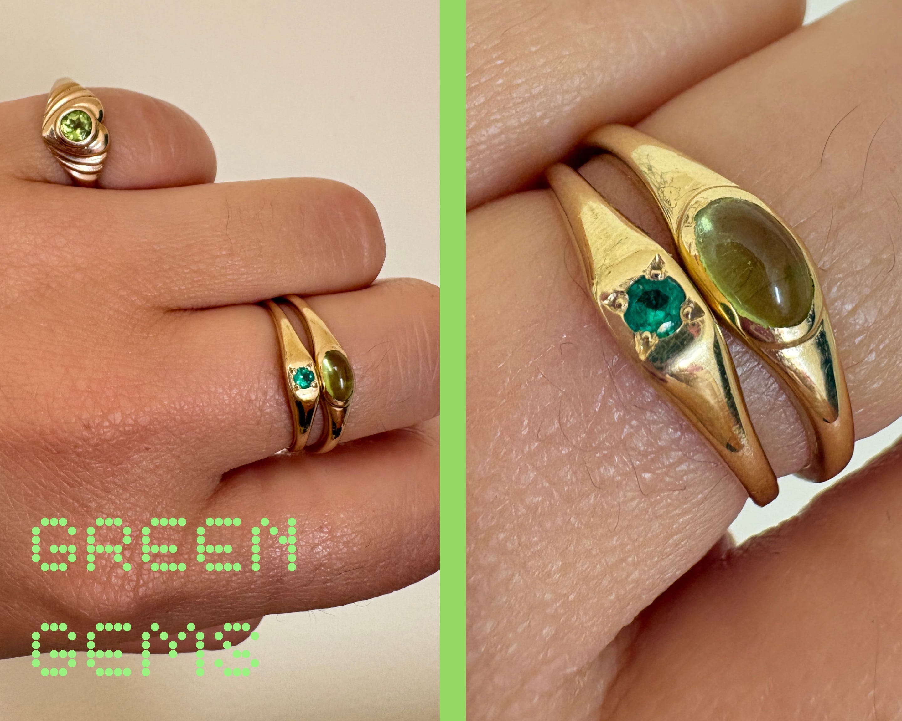 And here’s another green gem ring stack, without the big cabochon ring. Just to show how I mix and match.