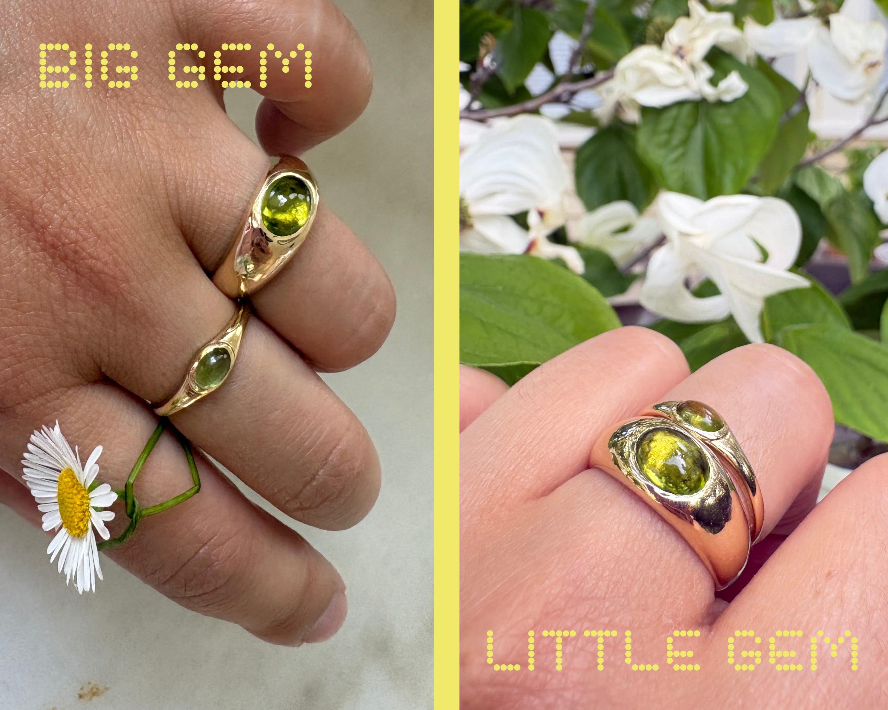They’re almost the same ring, but the size and proportion difference creates visual interest when worn together. The smaller one is from Loren Stewart (they do periodic sitewide sales). I call it my big gem & little gem, or the mom & the bebe.