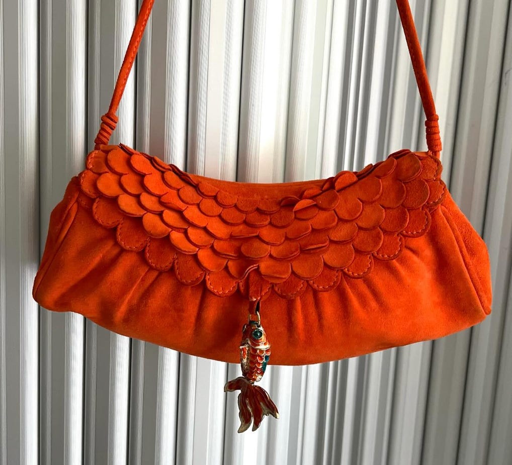 This is my latest fish treasure, which is on its way from a secondhand store in Korea that kindly agreed to sell to me via PayPal direct. It’s a vintage orange suede bag with scales as the bag flap, a little goldfish charm down the middle.