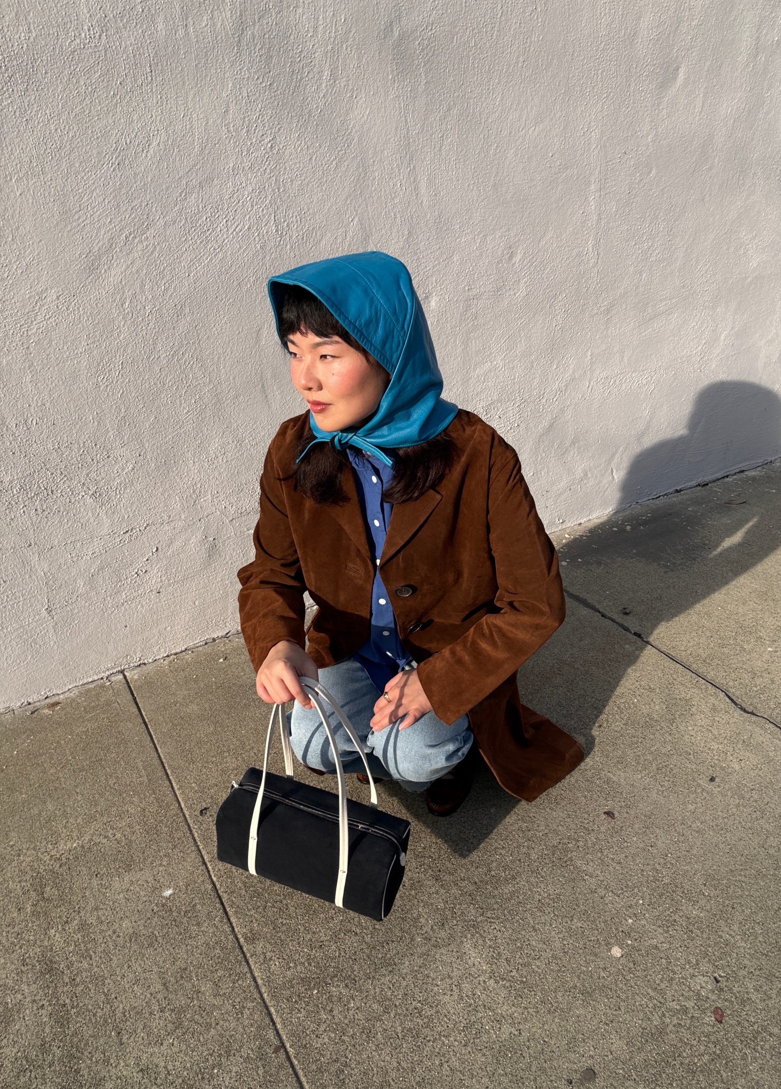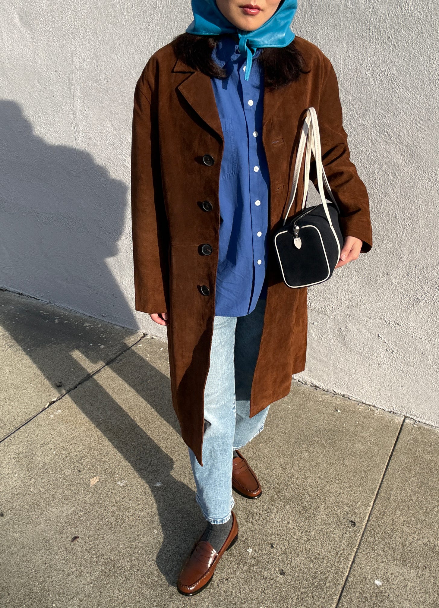 Suede topcoat / French blue shirt / Perfect vintage crop jean / Brioche bag / G.H. Bass penny loafers / Clyde leather bonnet (old)