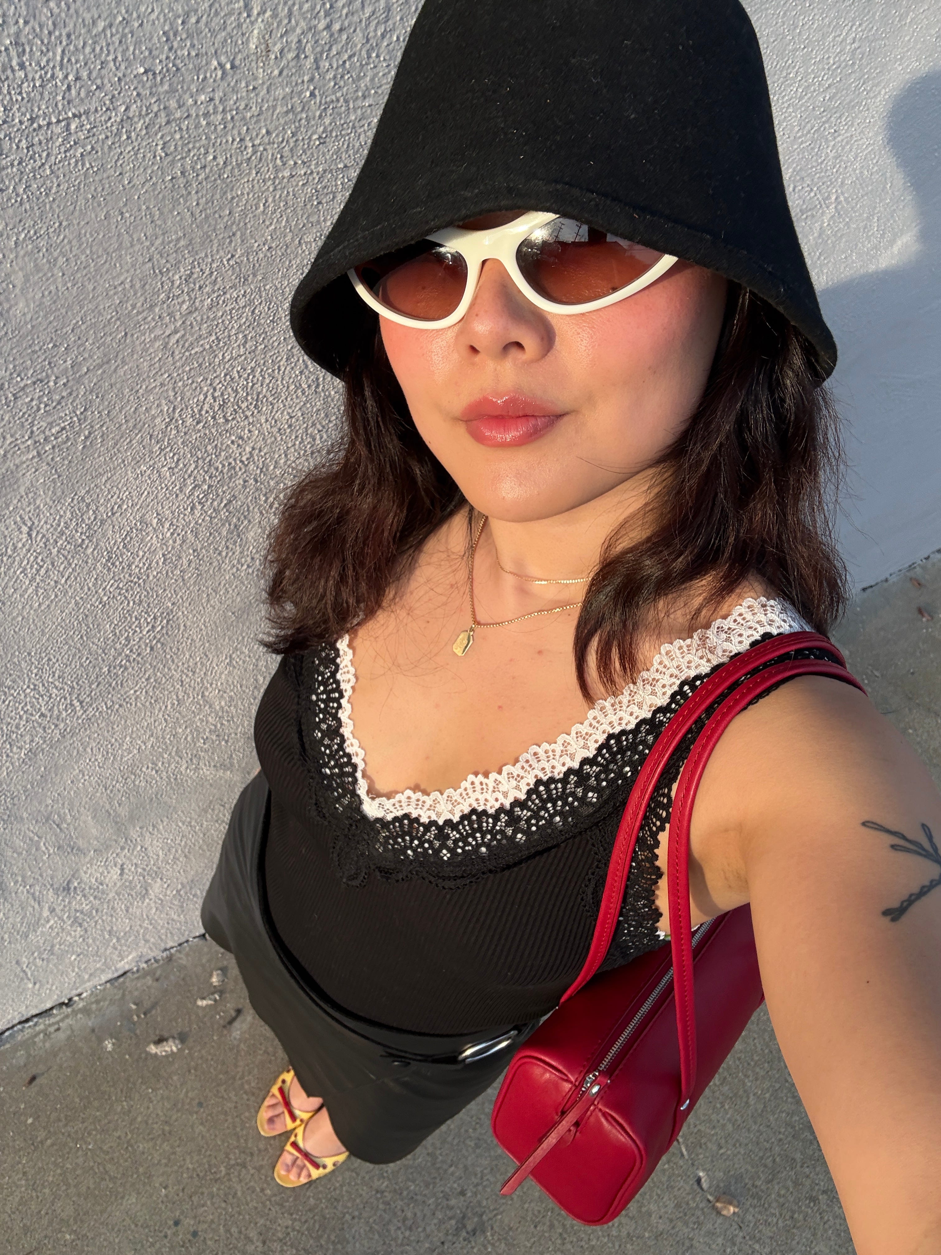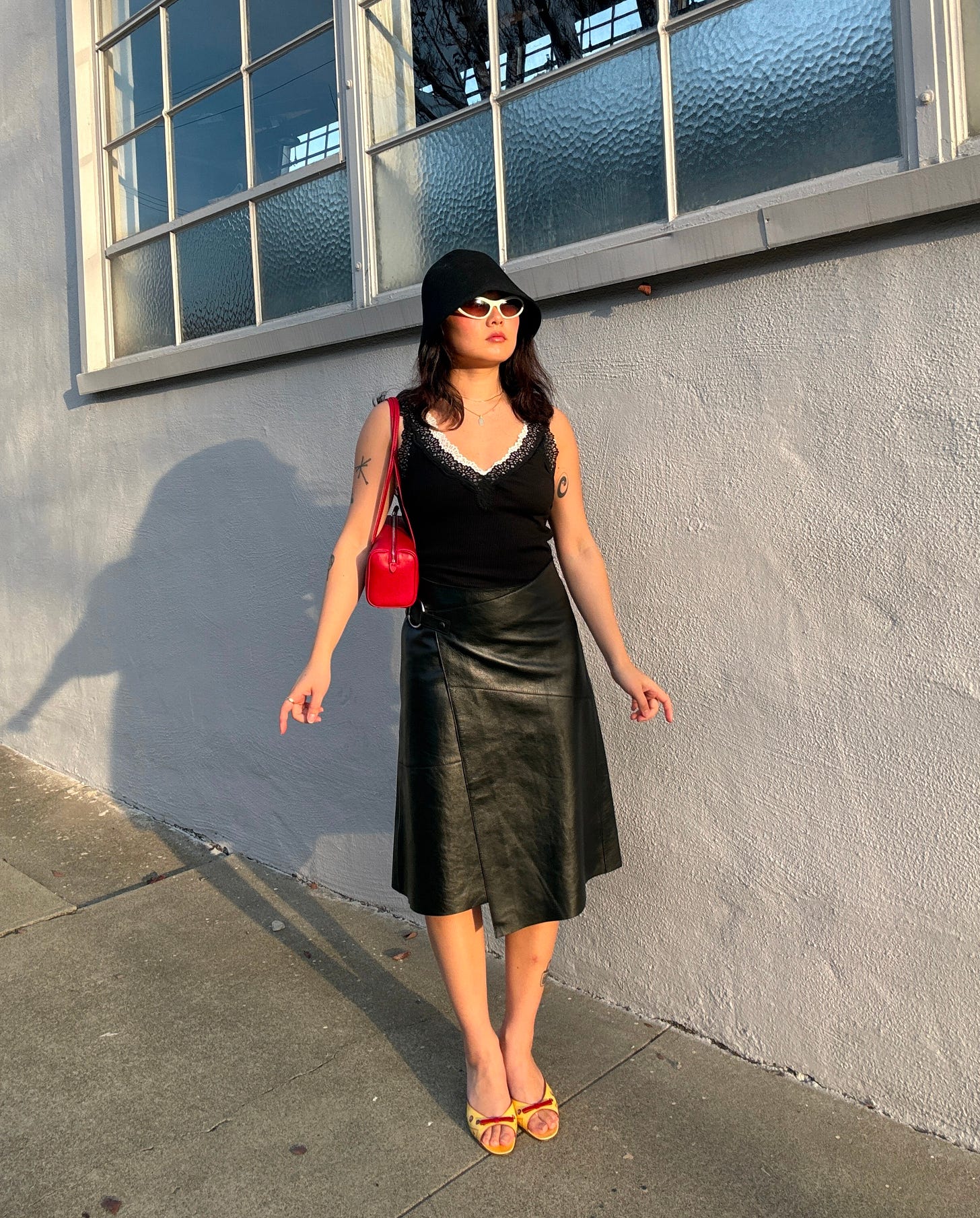 Lace trim v-neck tank (layered the white under the black) / Alexa Chung x Madewell leather skirt / Brioche mini bag / Clyde wool hat (old) / Prada heels (vintage) / Prada sunglasses (vintage)