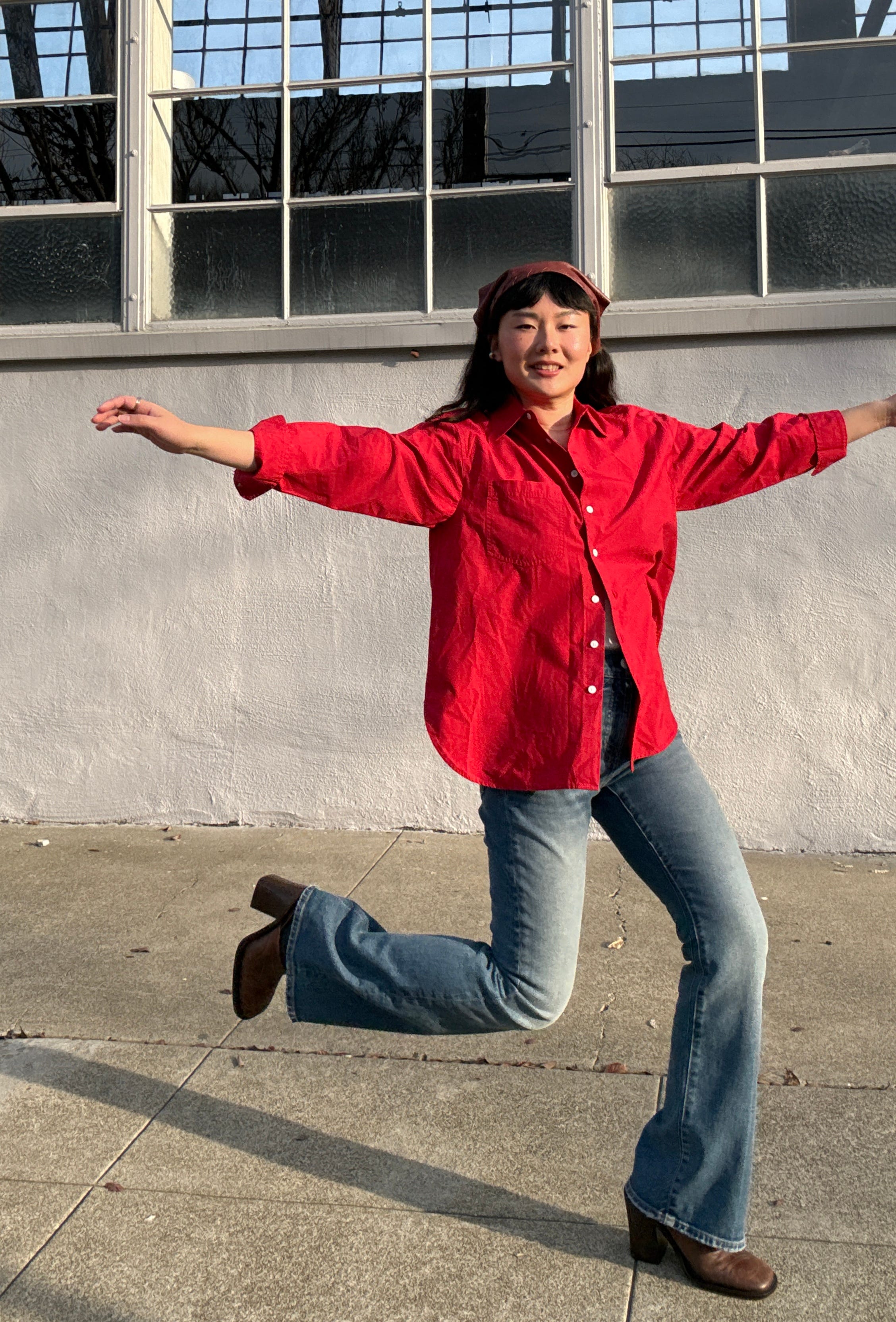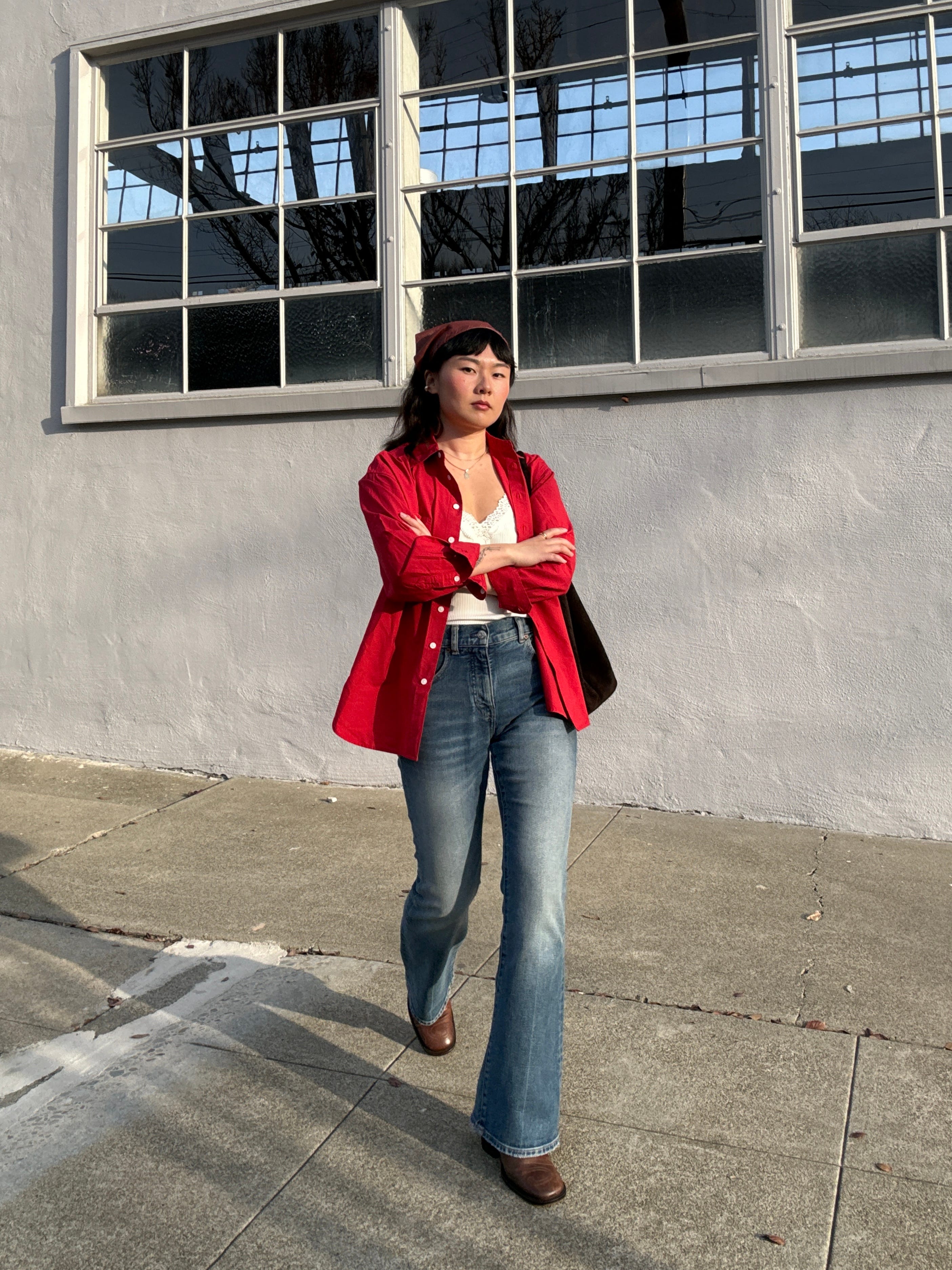Cherry red shirt / Lace trim v-neck tank / Flare jeans / Suede shopper tote / Clyde kerchief (old) / Frye mules (vintage)