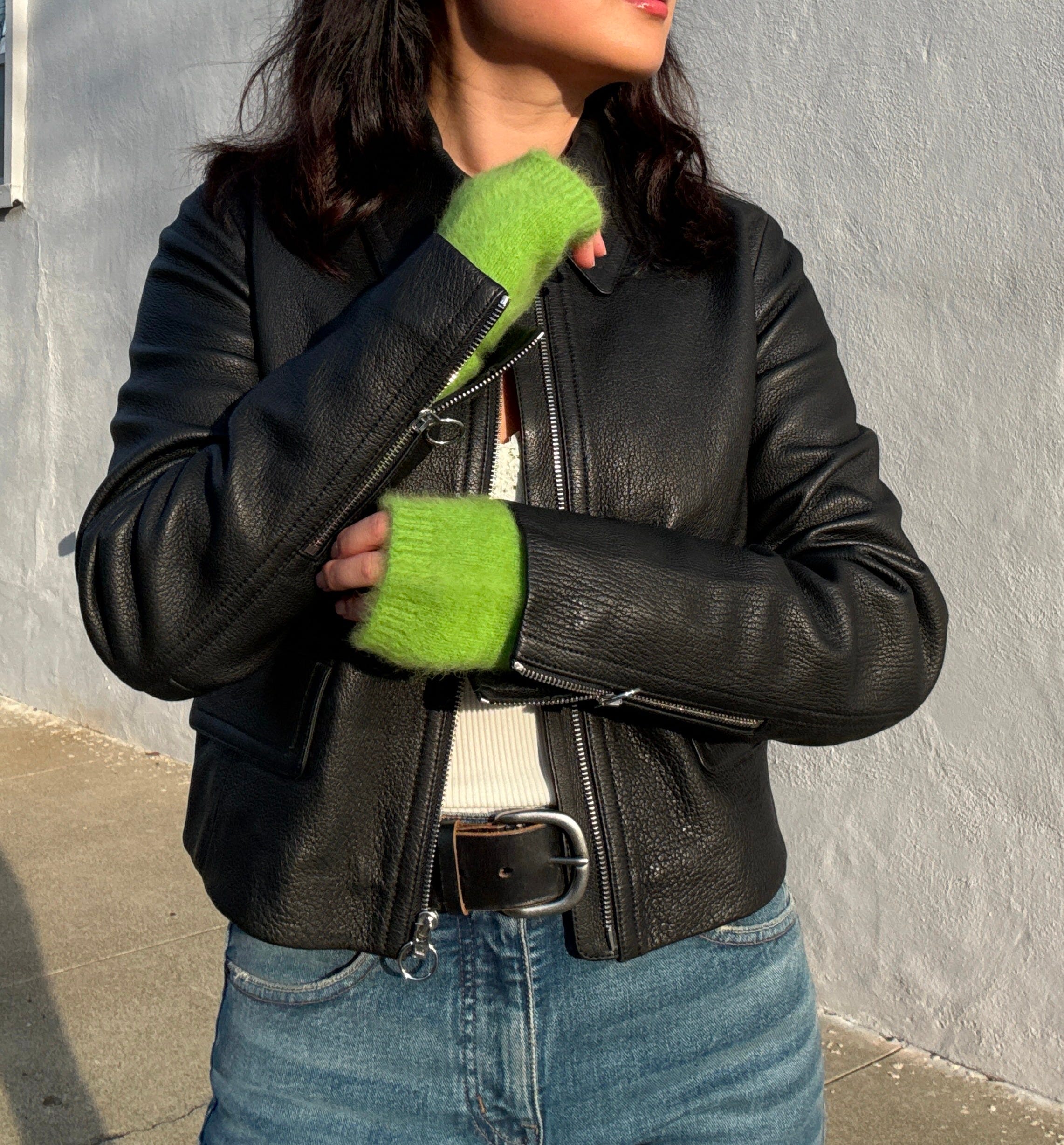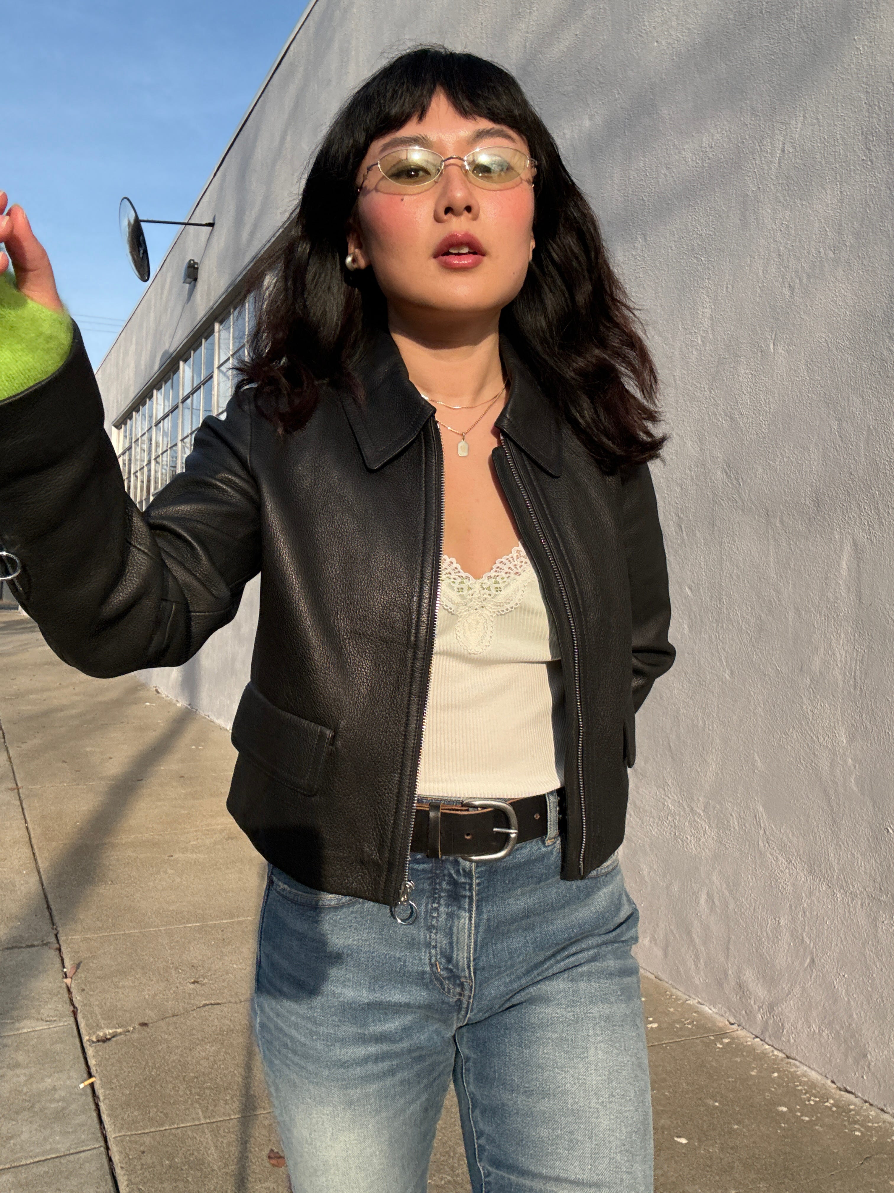 Cropped leather jacket / Lace trim v-neck tank / Studded leather belt / Flare jeans / Bonnie Clyde sunglasses / Armwarmers from Tomorrowland Tokyo