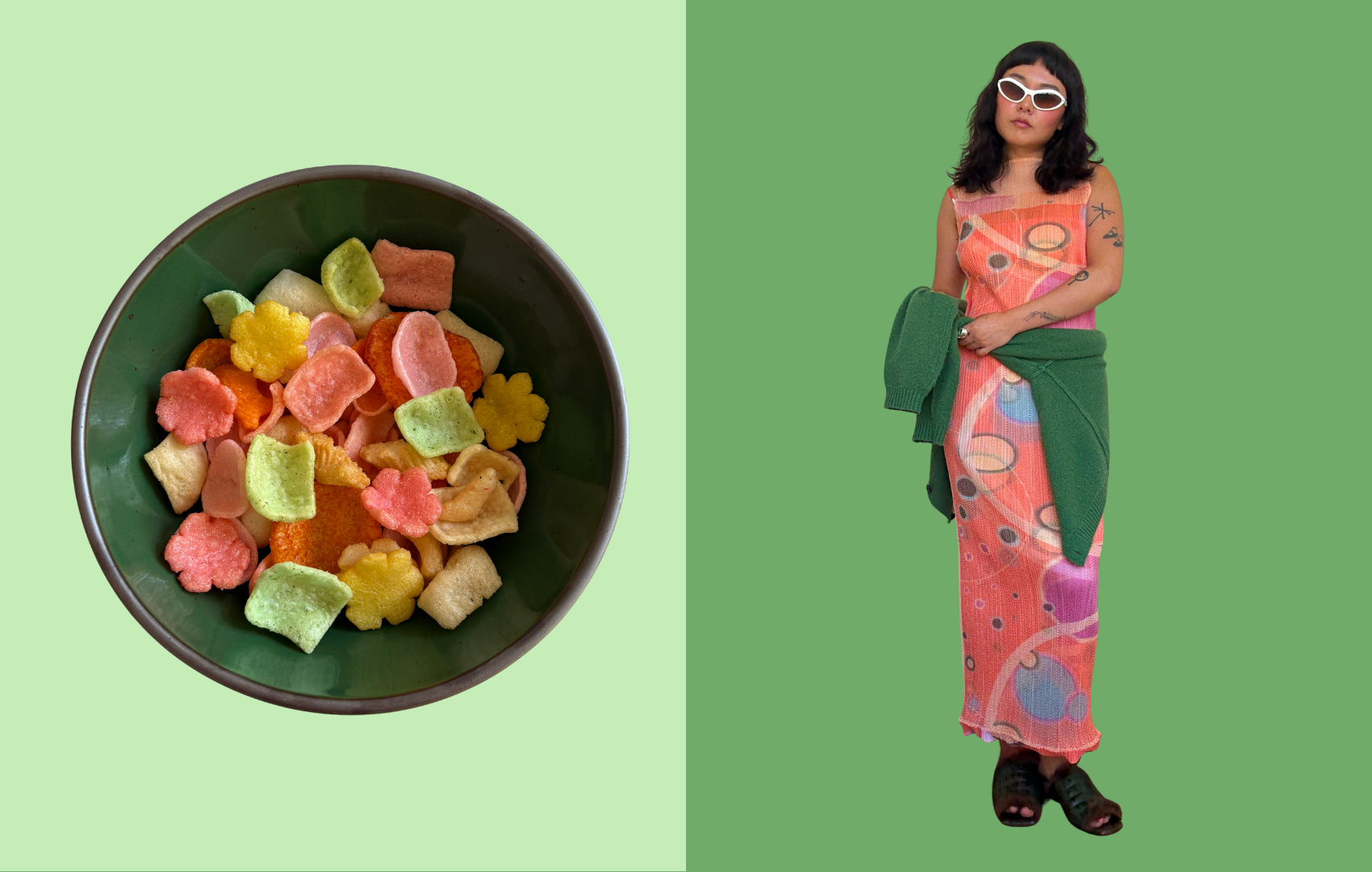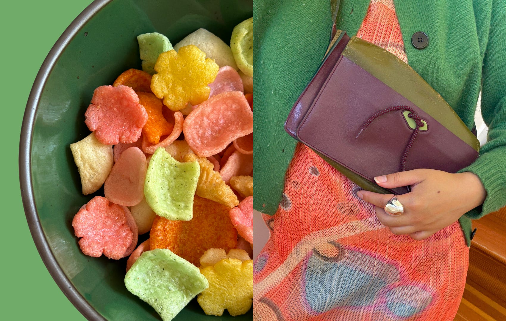 Green and orange are complementary colors, so this pairing exudes a certain chromatic electricity…a crackle and a fizzle. Not unlike the festive spirit of these assorted Japanese puffed rice crackers. They come in bright colors that give the illusion of variety. If I close my eyes, they all taste the same. But I swear that the pigmented orange and pink crackers taste sweeter than the beige ones…