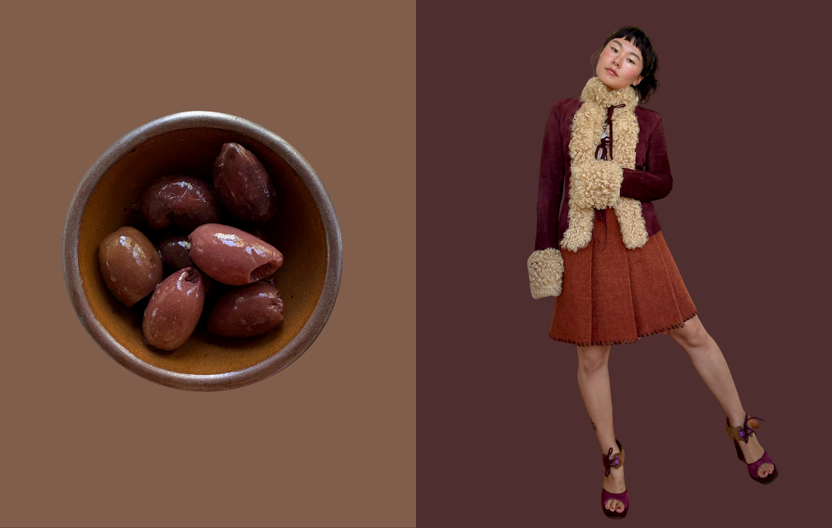 Given that September just started, we’re about to see sooooo many tonal brown outfits. I love it. The tonal effect is very 70s, especially when you factor in something shearling/fluffy-textured. For this color combination, I was inspired by a jar of kalamata olives in the fridge. Every olive is brown, but each one is ever so slightly a different shade. They’re smooth and glossy like the bowl.