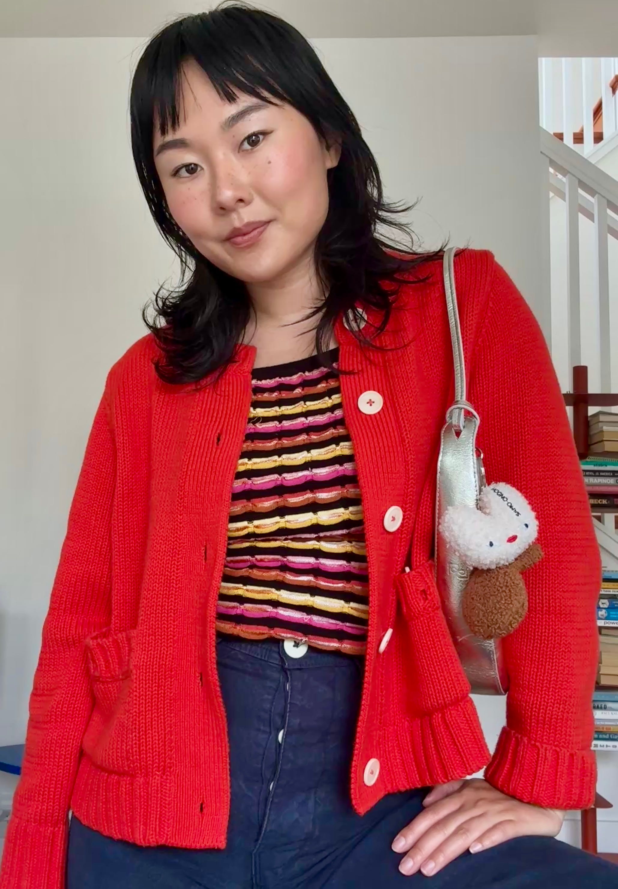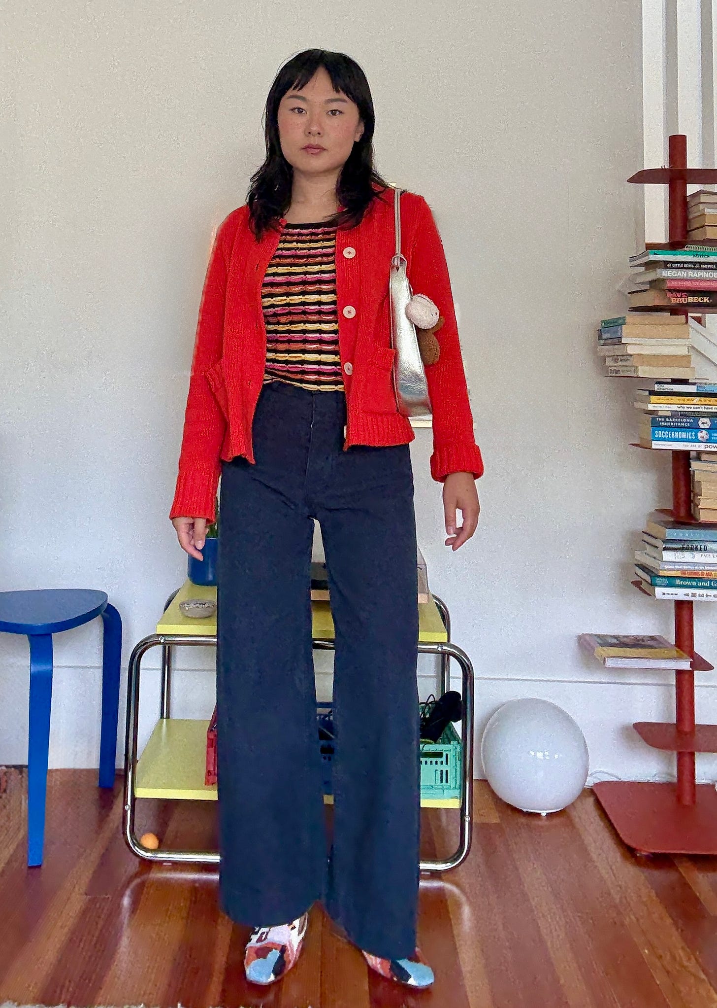 My favorite thing about the pants is the round white button at the top of the fly, which inspired me to button-match with a red cotton cardigan. With the embroidered mules (old Rachel Comey), the overall effect is something folksy and a bit kitschy.
