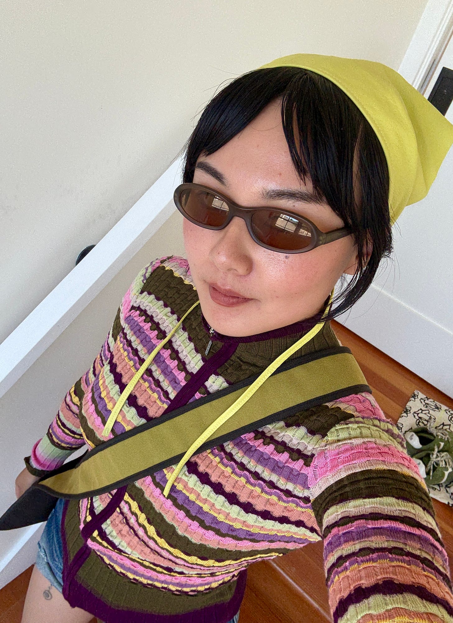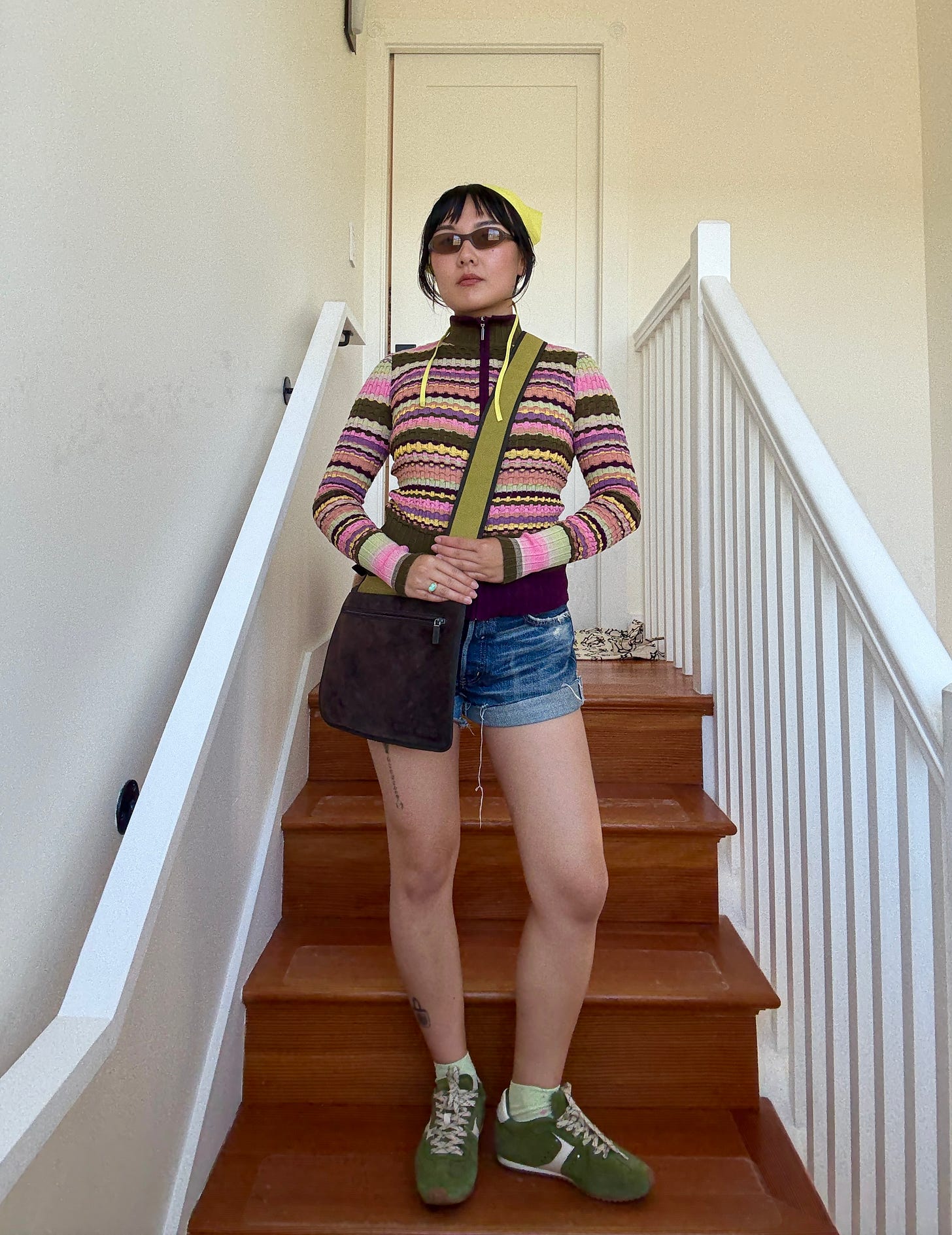 This jacket has the proper Missoni zigzag pattern and it reminds me of a gelato shop. Pastel hues but still earthy. I felt really sporty and cute in this outfit, it’s one I’ll be repeating. The technical Miu Miu bag, bandana, and green suede sneakers bring together a gorpy cohesion.