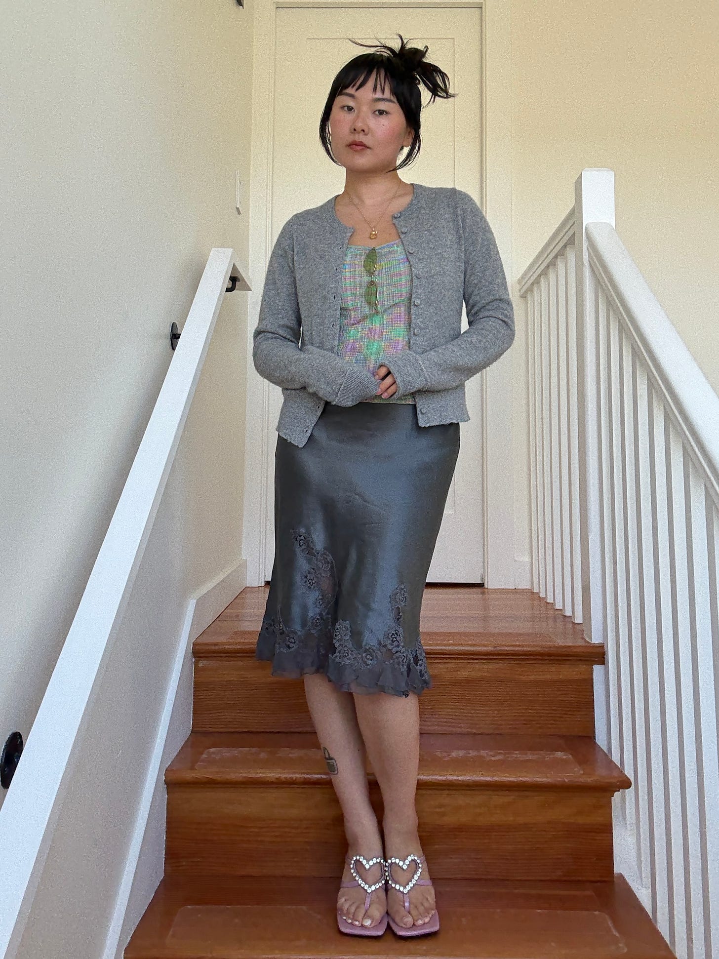 Fully leaning into Karlcore with the foggy gray tones. I wear this cashmere RE/DONE cardigan (a bunch secondhand online) when I want something warm but open in the front, and doesn’t sit too low on the hips. The gray bias cut silk skirt is from an Italian label called Renato Nucci (also a jp ebay discovery!). To keep this outfit from looking too prim or stuffy, I wore my blingiest Barbie heels, from LPA via TRR. They’re a patent pink thong heel with a giant rhinestone heart in the middle. I should wear these more.