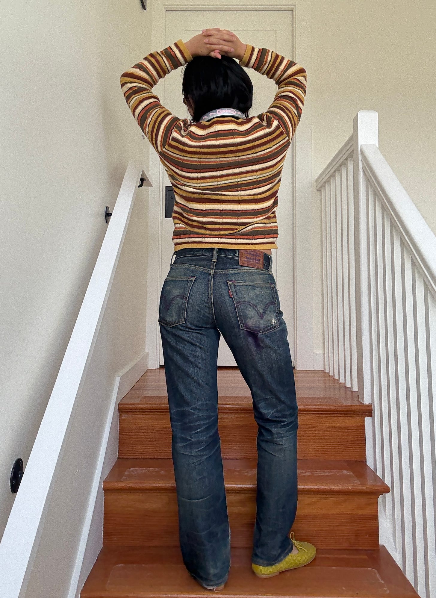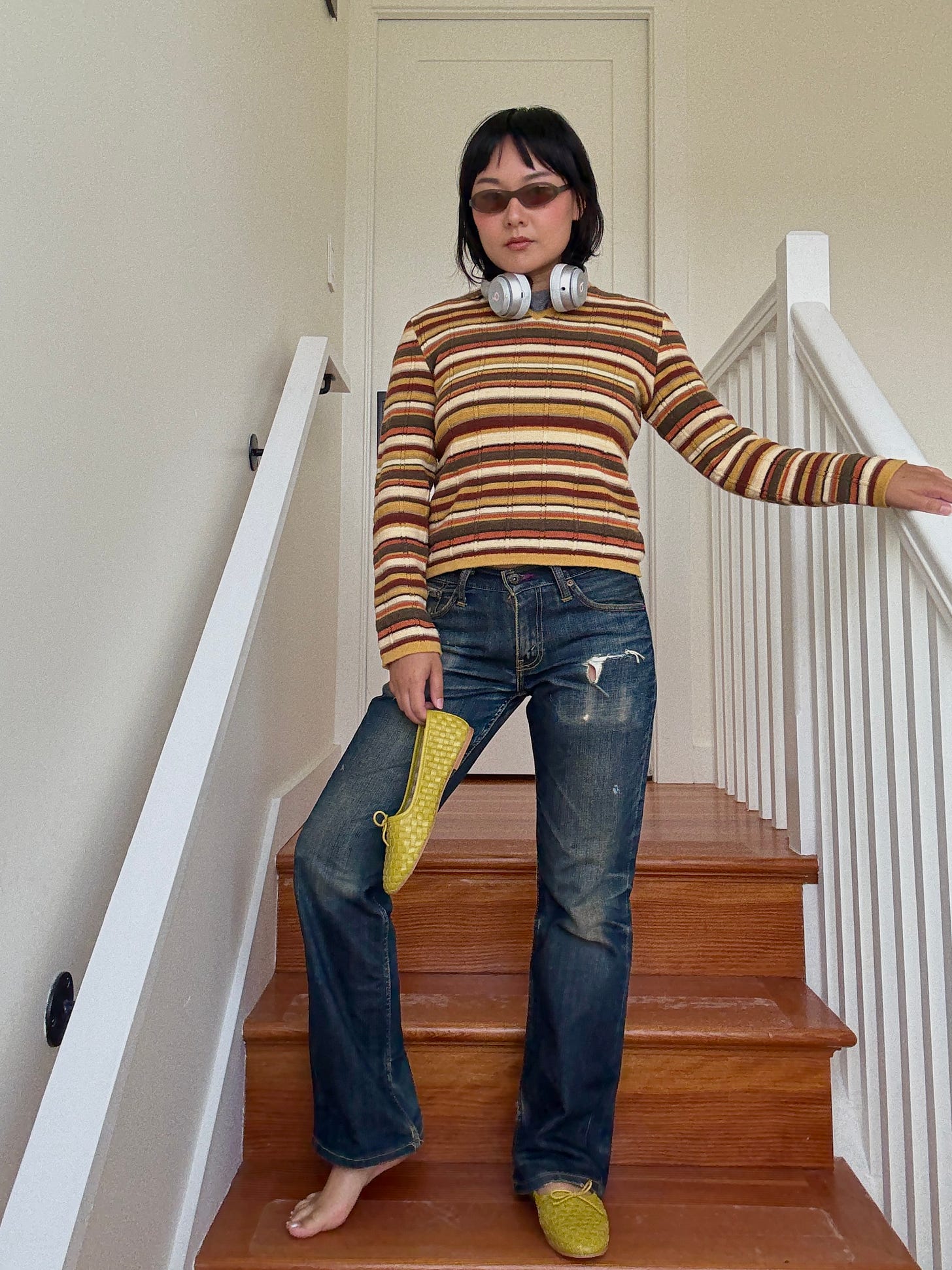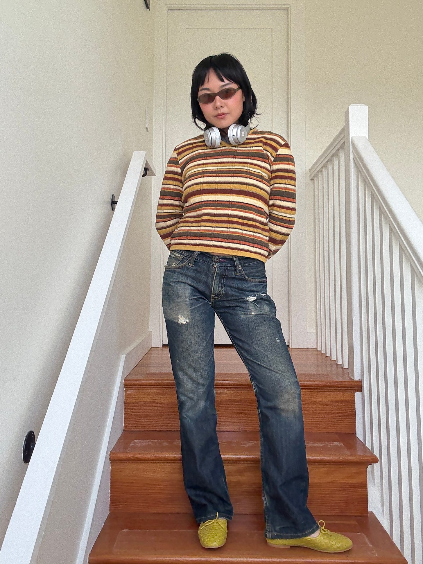 I layered a plain gray cotton crewneck tee under this vintage Missoni Sport merino wool V-neck sweater. The colors are very 70s: mustard, rust, umber, adobe. Paired it with these awesome jeans I don’t wear enough!!! They’re vintage (purple label?) Levi’s and one of the only things I bought IRL on my Japan trip last year. The fading and distressing drew me in.