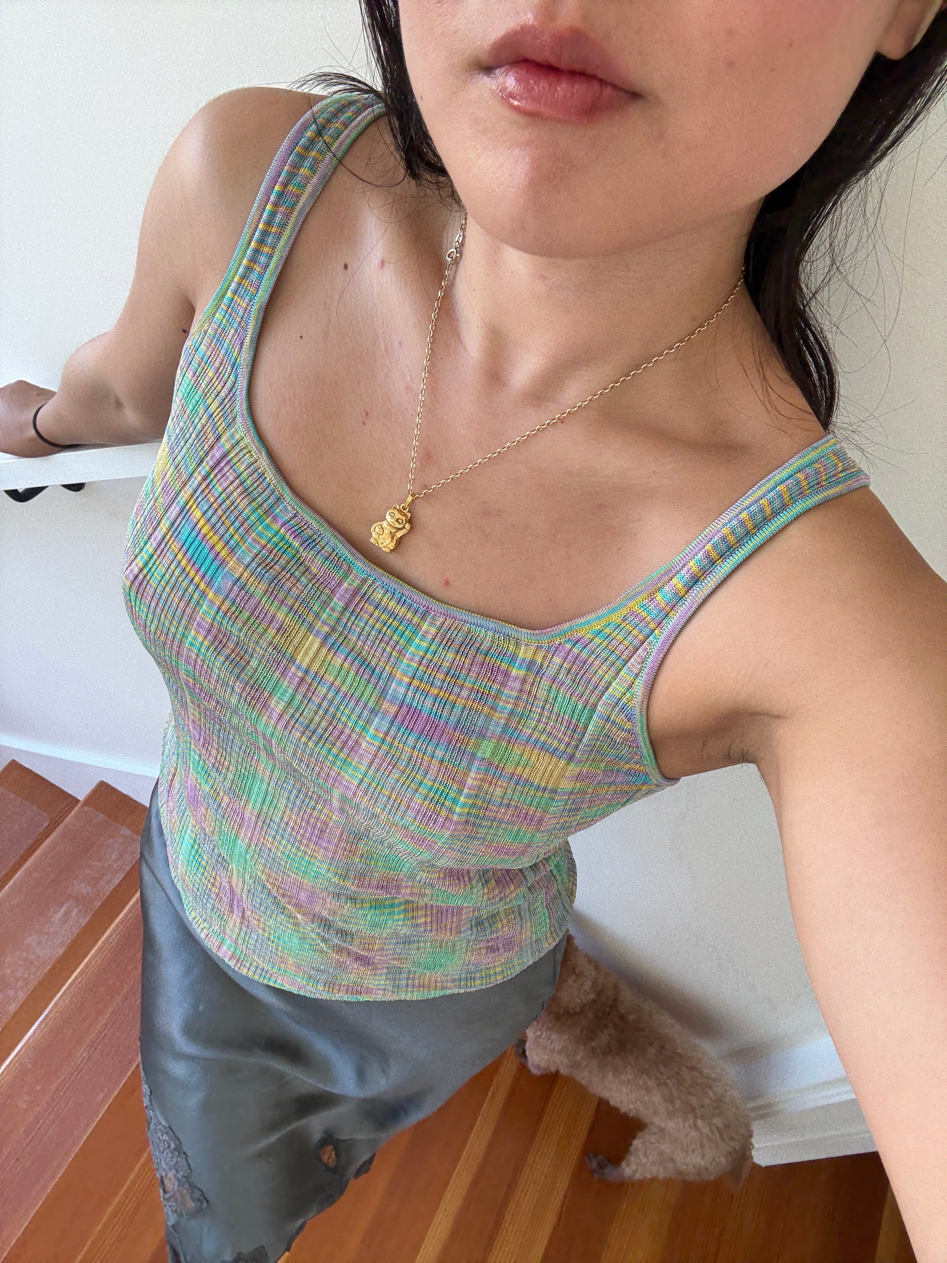 I forgot who posted this Note on Substack (it’s so hard to keep track…) but a girl wrote something about wanting to dress like Rainbow Fish this summer. This is definitively a Rainbow Fish top. That is, rainbow not in a “crayola” way but in a shimmering aquatic refracting light through a prism way. Like that tiny colorful part of a soap bubble.