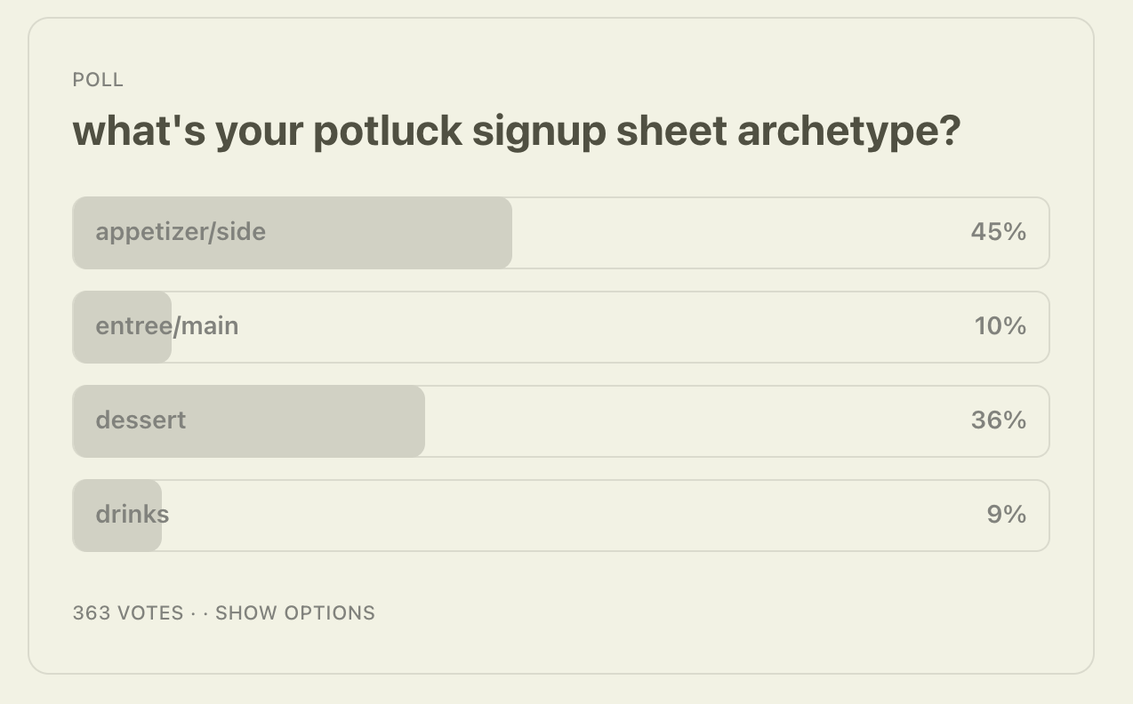 Most us have been using potluck signup sheets lately for food-centered seasonal festivities, and I was curious about (1) what categories are most popular/get filled the fastest and (2) what does it say about you as a person?! That seemed like an anthropologically amusing jumping-off point to brainstorming holiday outfits.