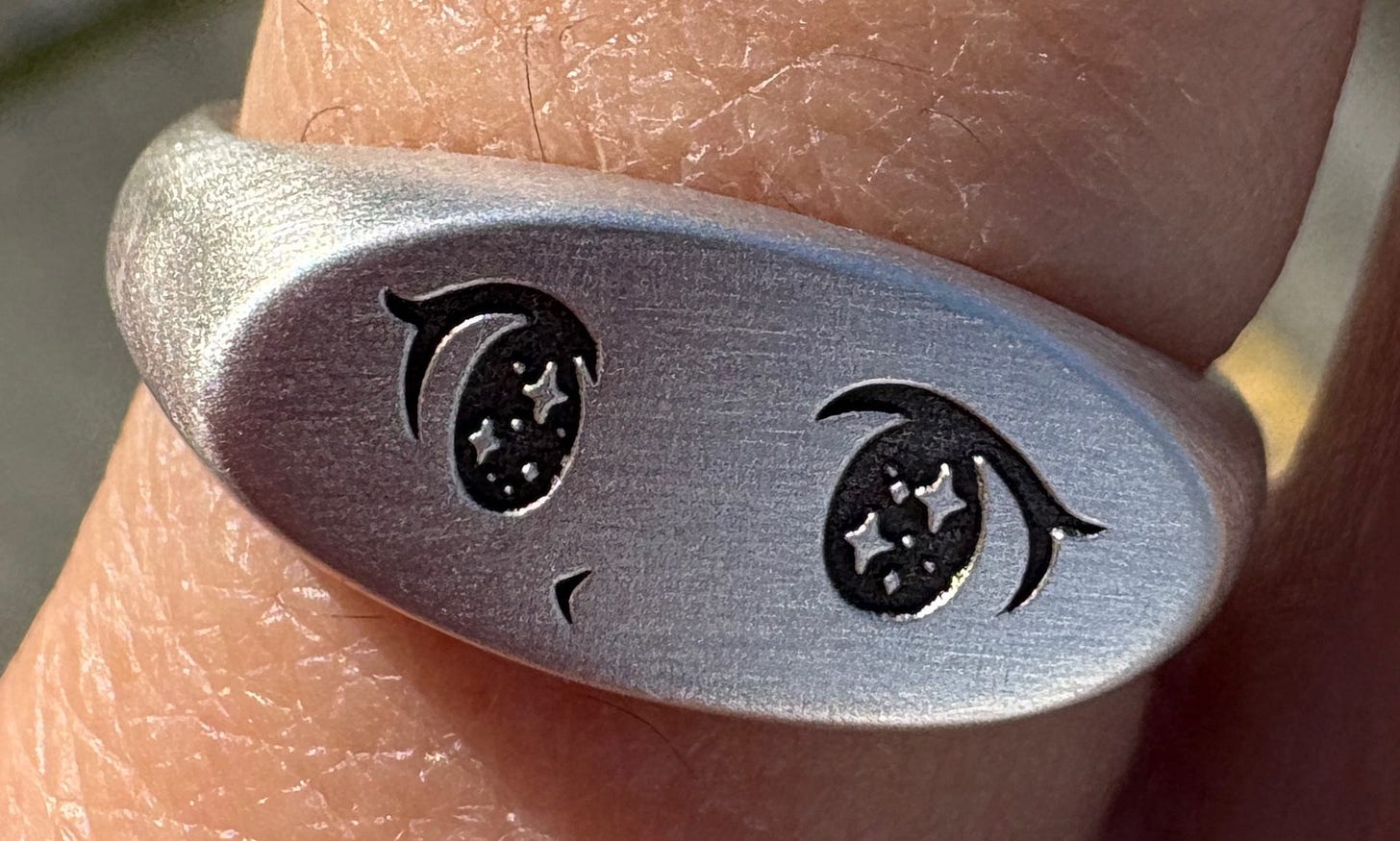 This was truly love at first sight. I loved the soft edges of the long oval shape, and the engraving gives a satisfying contrast that pops on my hand. It’s a brushed matte finish.