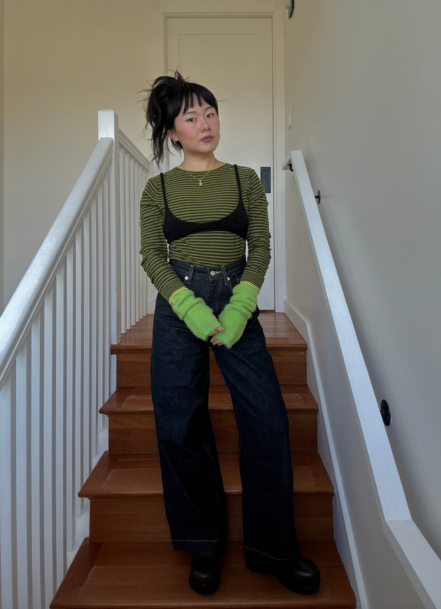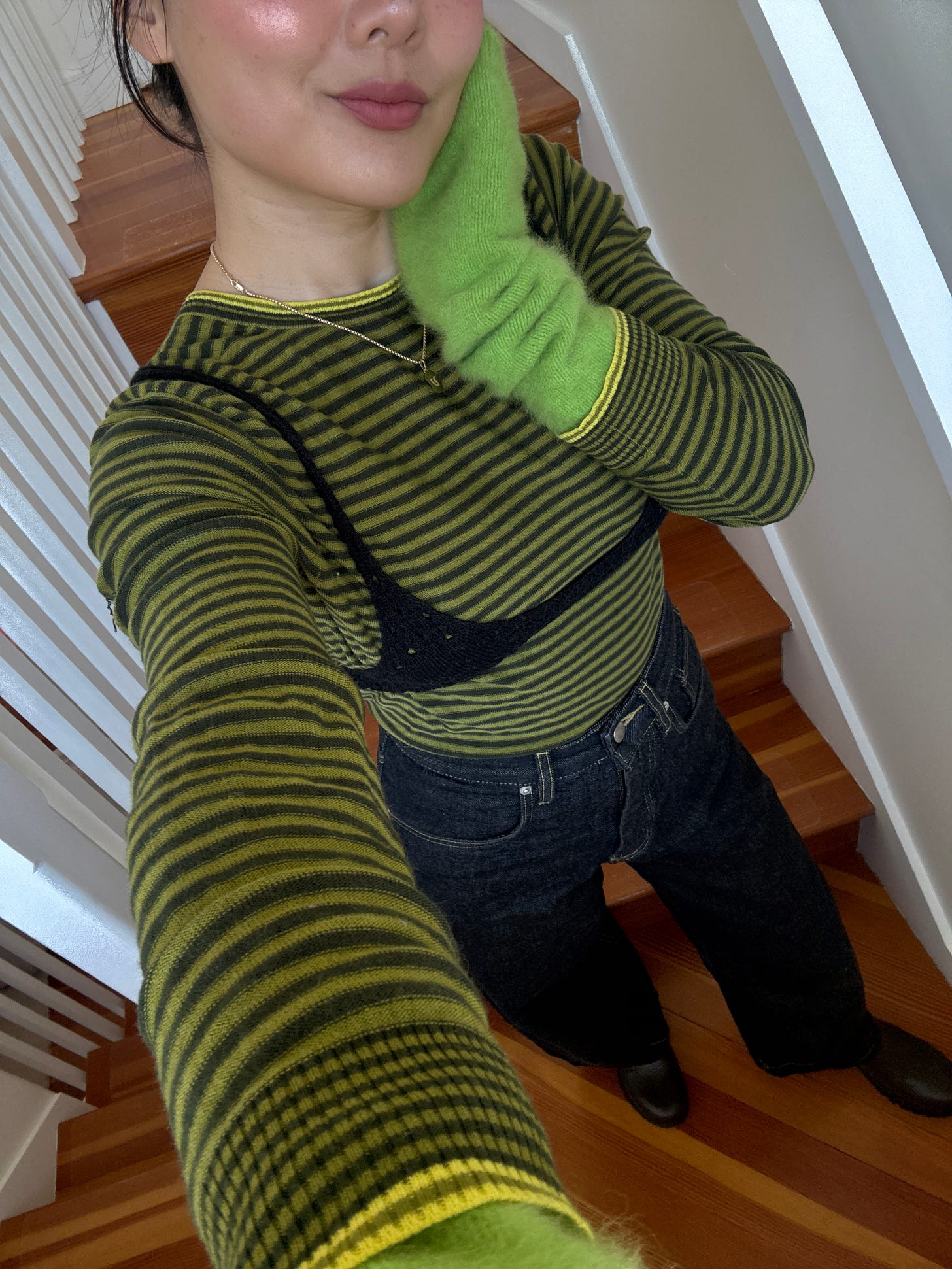 I think a lot of us are defaulting to an outfit base of long-sleeve top and jeans in the winter. It’s an easy formula. This striped cashmere top was a secondhand find from last fall—it’s the perfect layering weight. The stripes are interesting on their own, but what can I do to make it feel more ~styled~ and creative?