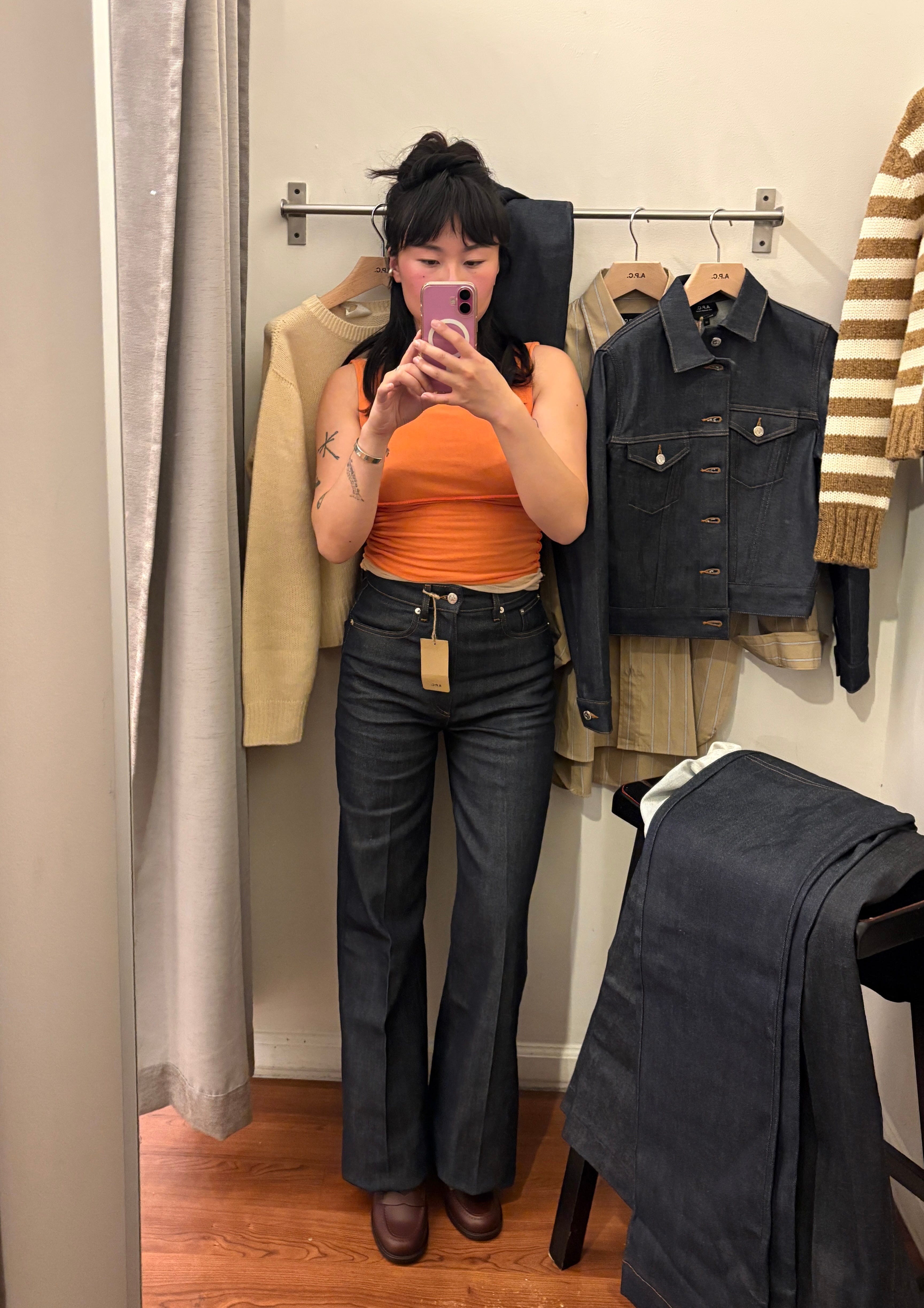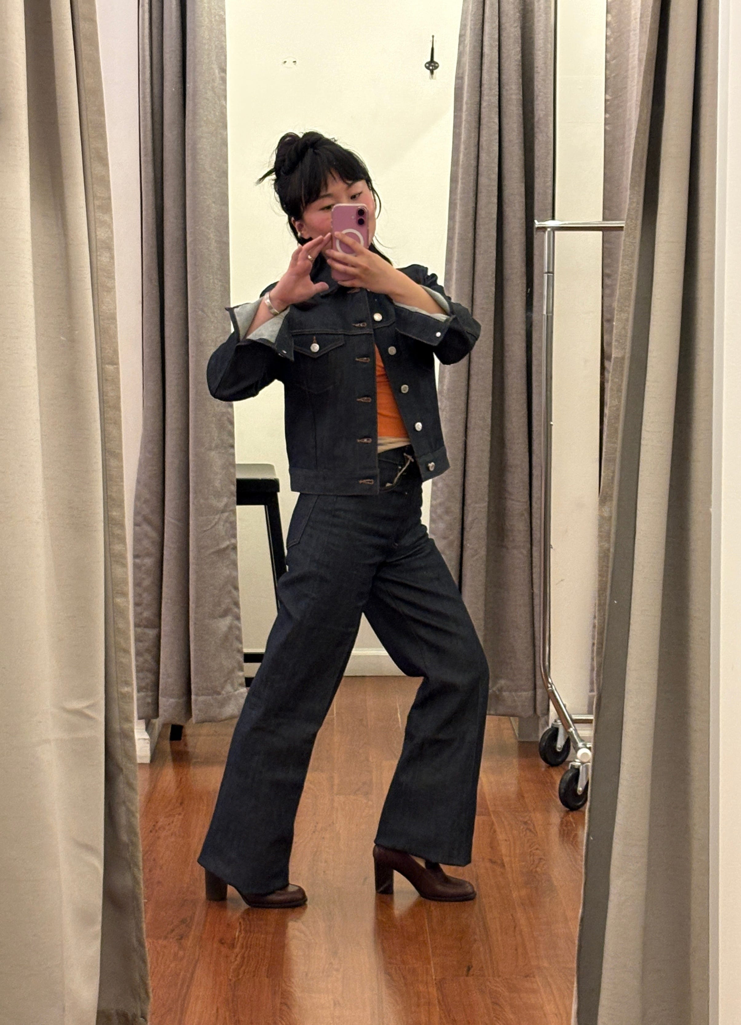 I try on all the jeans and they are all too long on me, but Aubrey the store manager reminds me that they offer hemming. My favorite dark wash jeans I own would have to be the Studio Nicholson Neive and the Auralee Hard Twist (here’s a pair on TRR), so I’m mentally comparing every style against these.