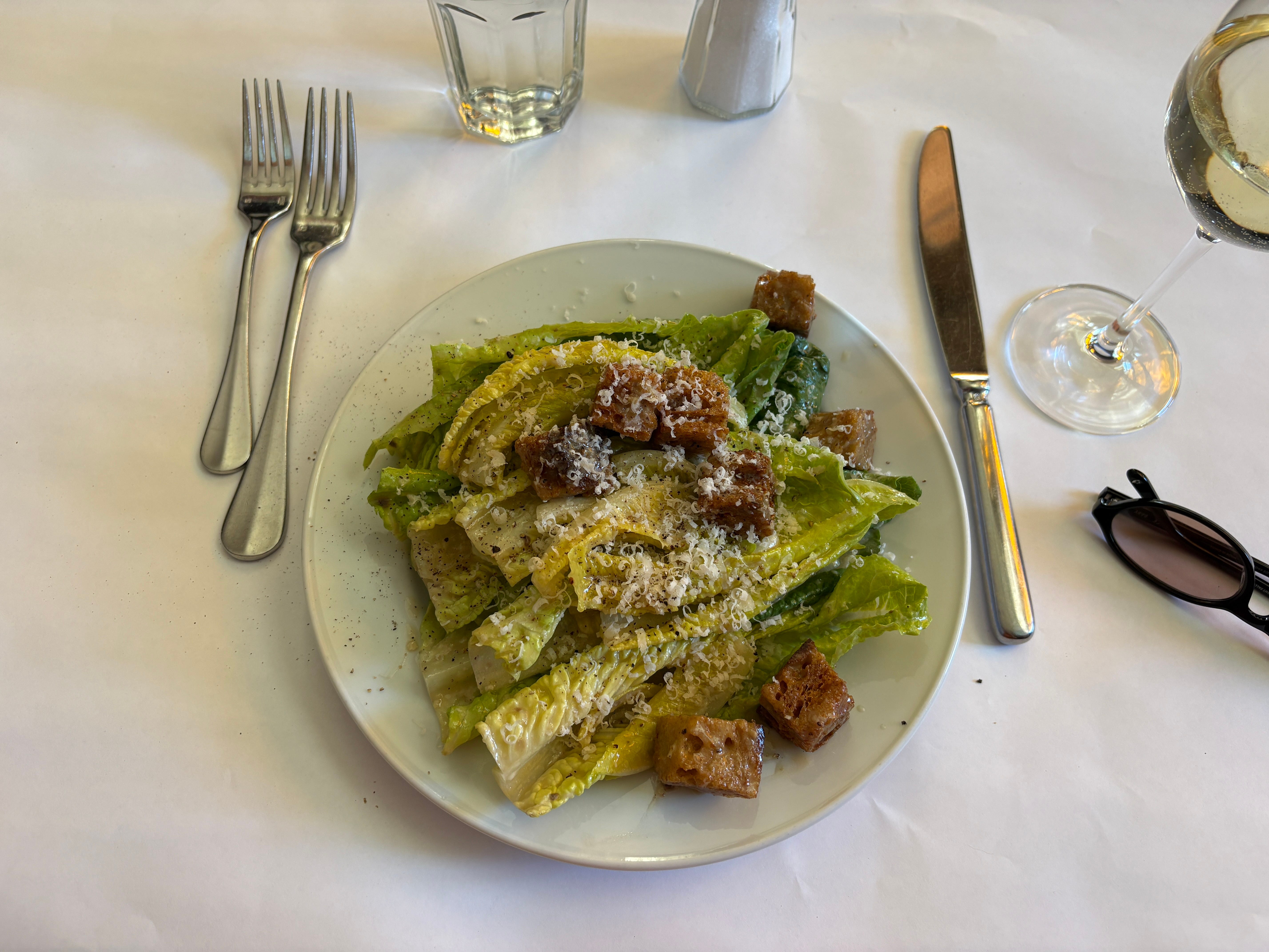 I couldn’t get a reservation but luckily, they’re able to accomodate my walk-in party of one. The hostess seats me between a pair of “ladies who lunch” tables. Everyone is gossiping with white wine, caesar salad and shoestring fries.