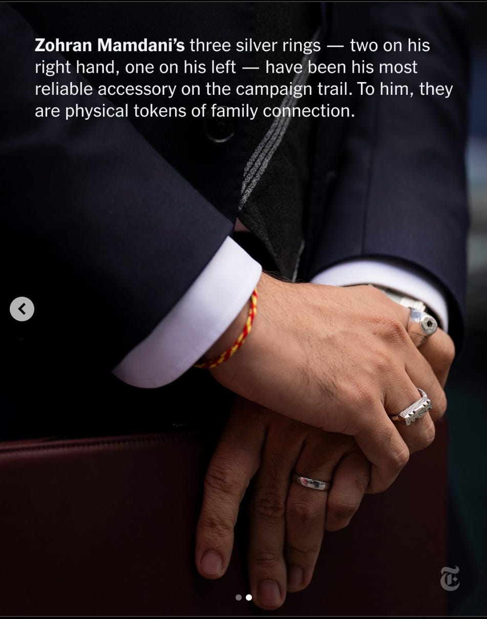 Here on the Molehill, we recognize fashion as a reflection of our sociopolitical climate—and I’m excited about what the Mamdani era will bring, both politically and sartorially. This article broke down the story behind the signature silver rings he wore on the campaign trail. One is a simple wedding band, one is an heirloom from his grandfather, and one is a silver ring from his wife, artist Rama Duwaji.
