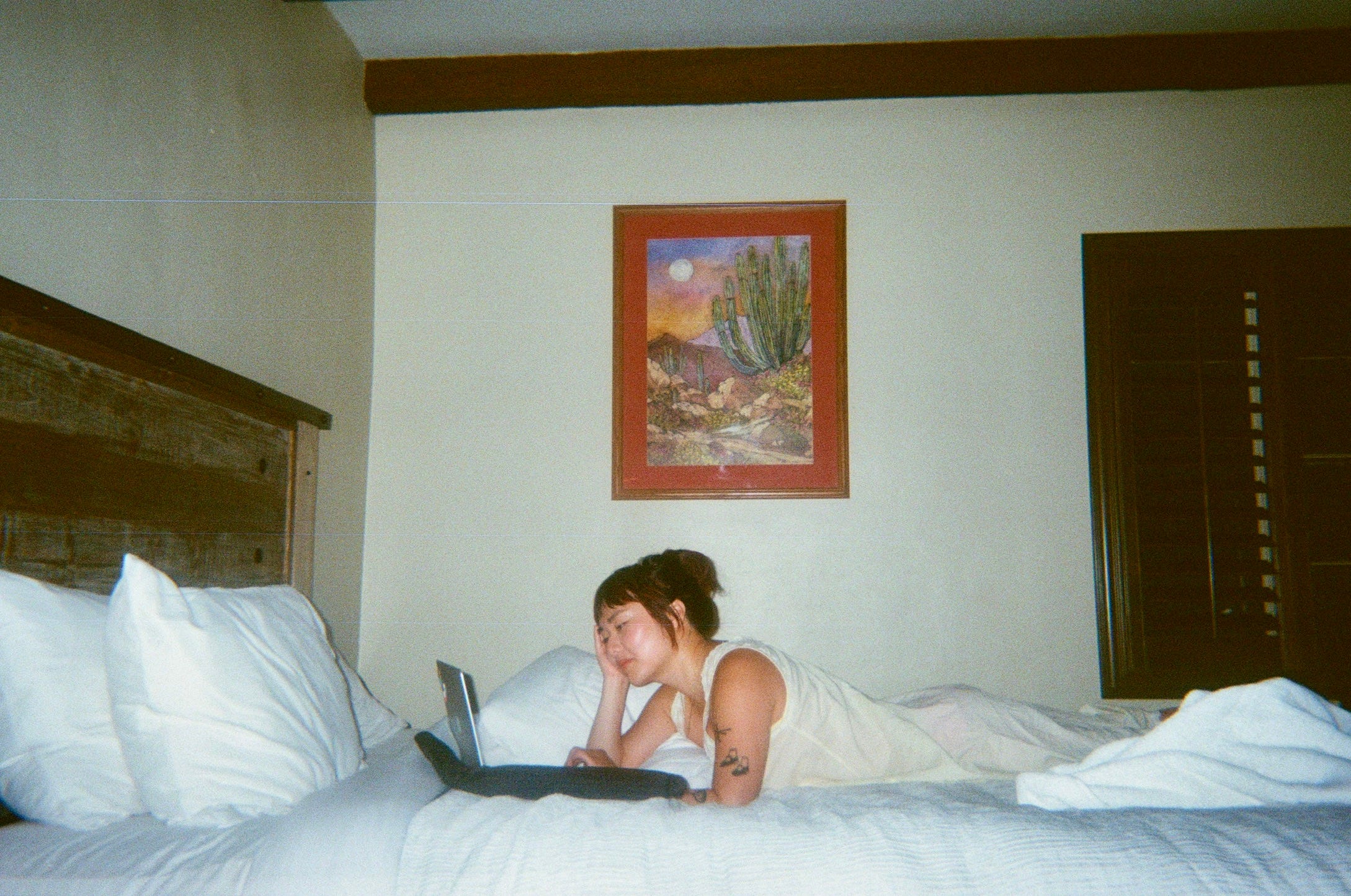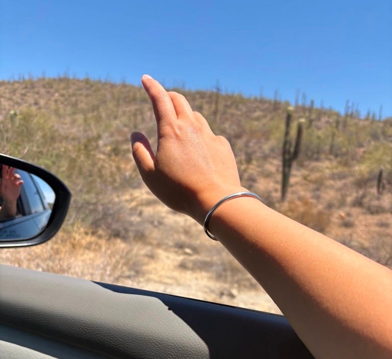 We flew through the road names I’d gotten familiar with the past few days—Broadway, Alvernon, Fort Lowell. I squinted at the passing landscape with dry eyes, while the music boomed and we bounced in our seats at the red lights. Strip malls with all the chain stores we have everywhere in America, but “Arizona-fied” with saguaros. Neon signs advertising taquerias and accountants. Bus stops with cactus-shaped columns. Empty parking lots and infinite dark sky. A single snagged bead fell off my mesh dress and onto the floor of the car. I didn’t bother to find it. Let it be lost forever.