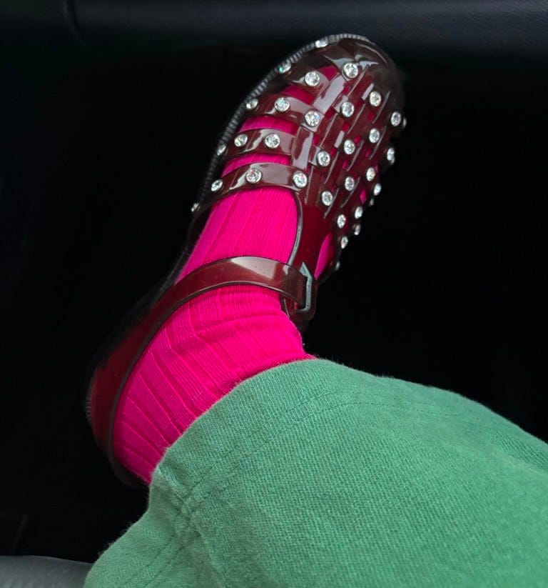 These were suitable for leisurely walking, nothing too intense. You need a car to get around in Tucson so I was not taking more than 6K steps a day in these. I wore them to the pool (waterproof) and to dinner (sparkly). I wore them with different colored socks, which gave the clear jelly color a slightly different tint each time. These have no arch support so be aware of that. I wouldn’t wear them hiking or for cobblestone, obviously.
