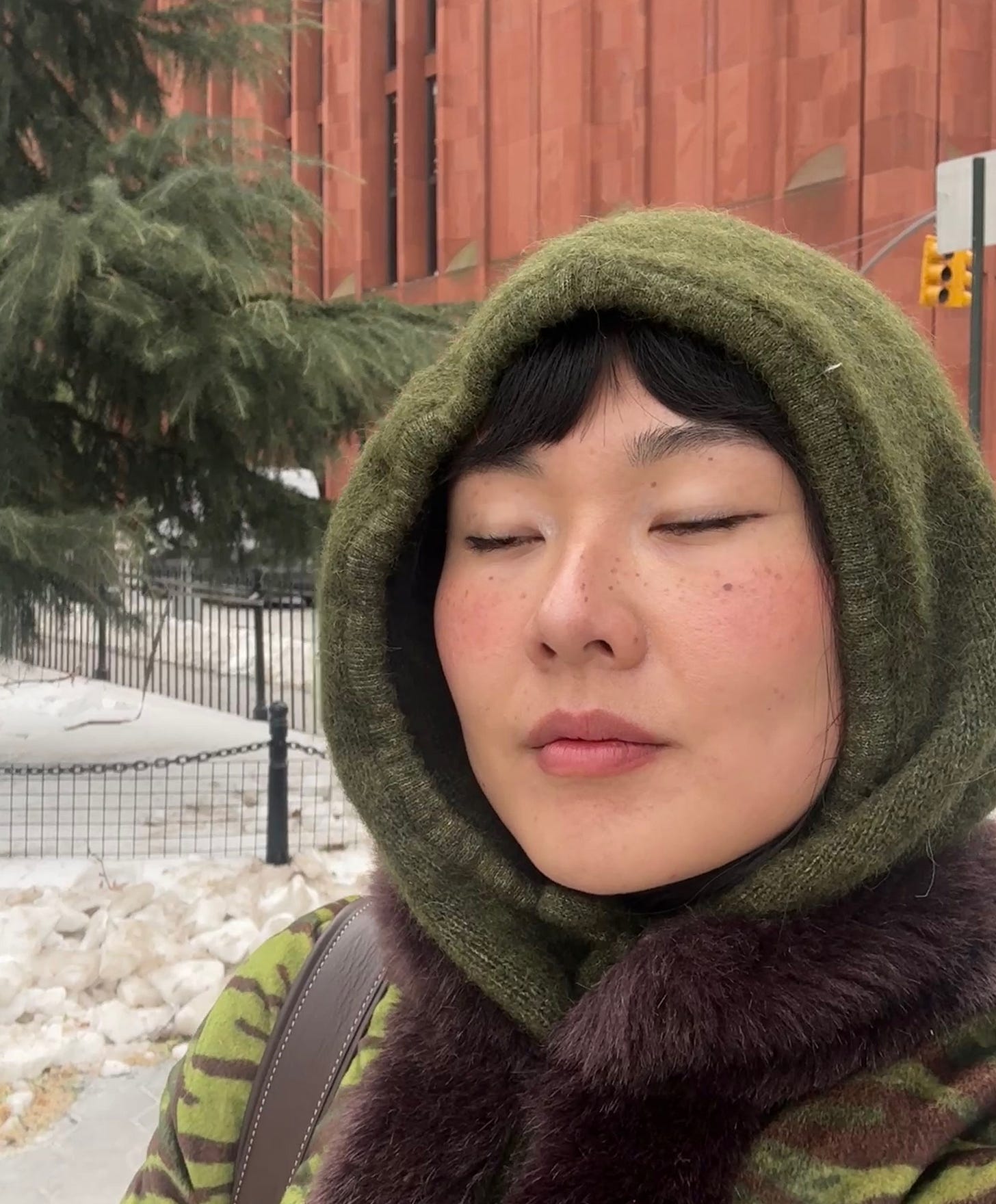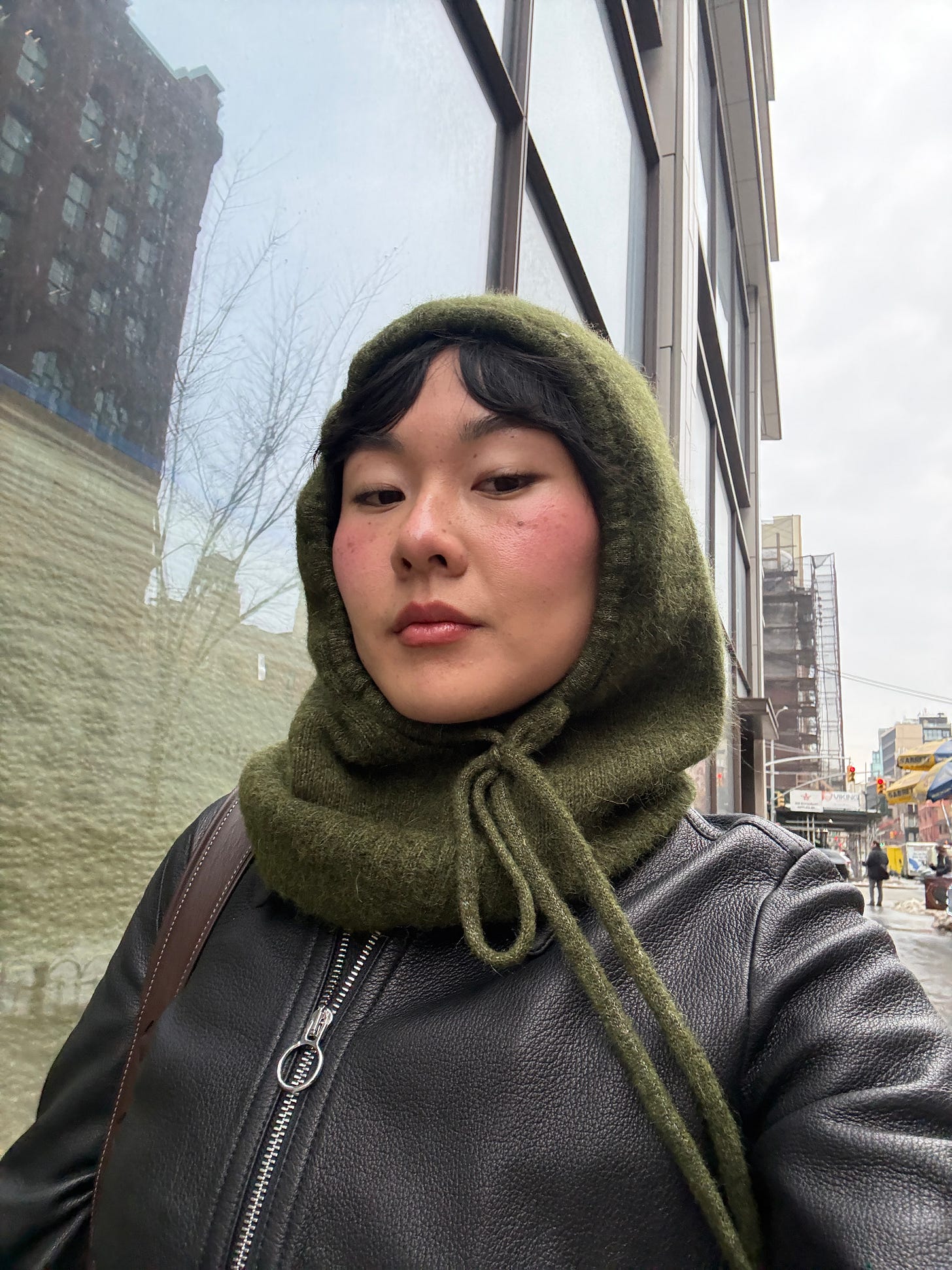 Next, they tried on the moss green wool snood that kept my head warm in New York. That was a keeper too. I think this design is ideal for people with bangs because it minimally presses down on them, unlike a beanie. I hate beanies. I also like how you can tuck it into a coat collar, or let it layer over (pictured below).