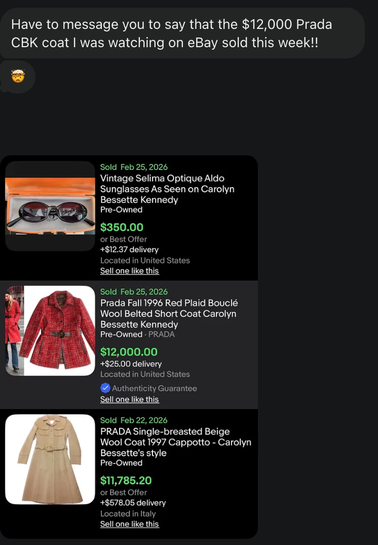A reader sent me this update re: CBK-mania on eBay. I think Love Story is the biggest fashion-y TV show at the moment and we cannot escape it. Preparing myself for the aftershock of tomorrow’s episode.