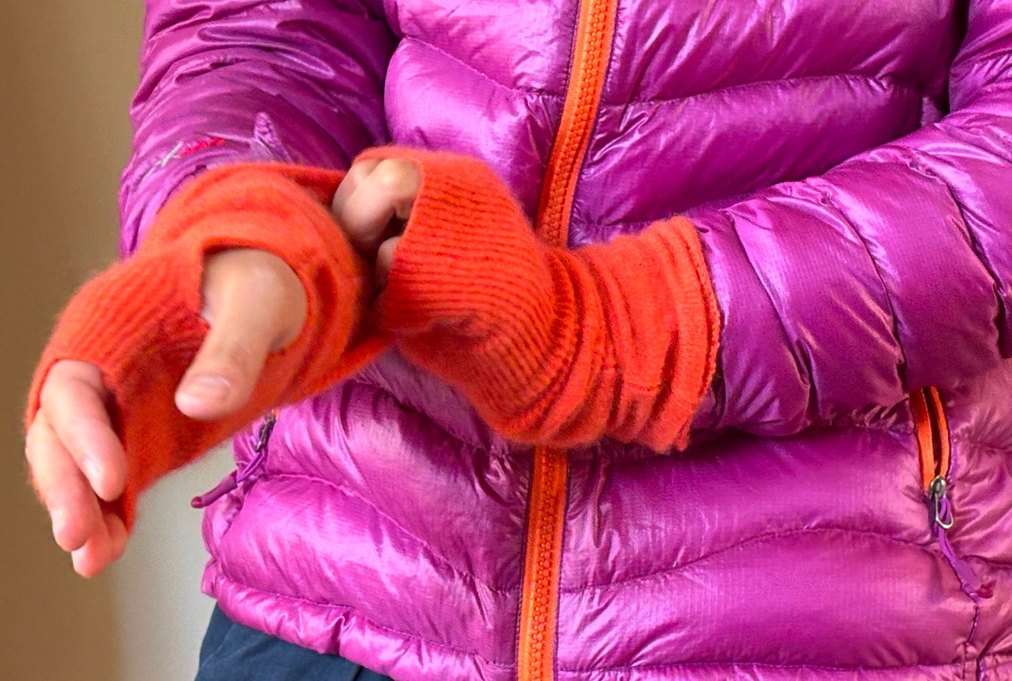 The last cherry of the pick was this magenta pink, orange trim lightweight down puffer from Mont-bell that I got secondhand for $35 on Mercari. If I’m gonna do a sporty down jacket, it has to be in fun colors! (Green is also nice). I got it because a reader shared a cold weather layering tip: wear a thin down jacket underneath a big oversize wool coat to look stylish.