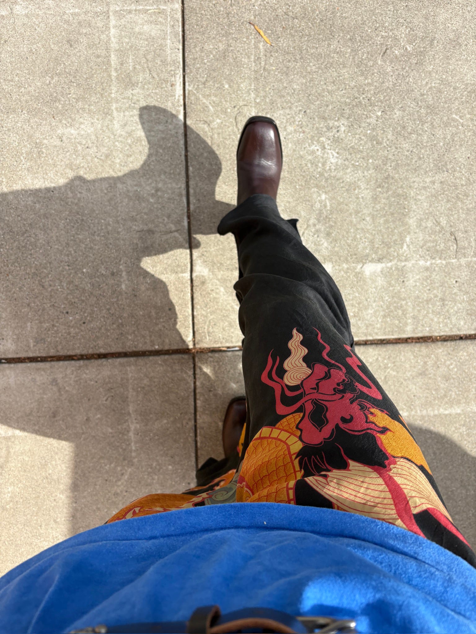 I actually donāt own many menās fit graphic tees, so I kinda struggled to style it. Tried tucking it into jeans but there was too much fabricā¦.tried a floaty silk skirt but it just made the thickness of the tee exaggerated in a lopsided way? Imagine a potato on top of an bonito flake. It needed a bottom with heftier material, but with a waistband I could tuck the tee into.