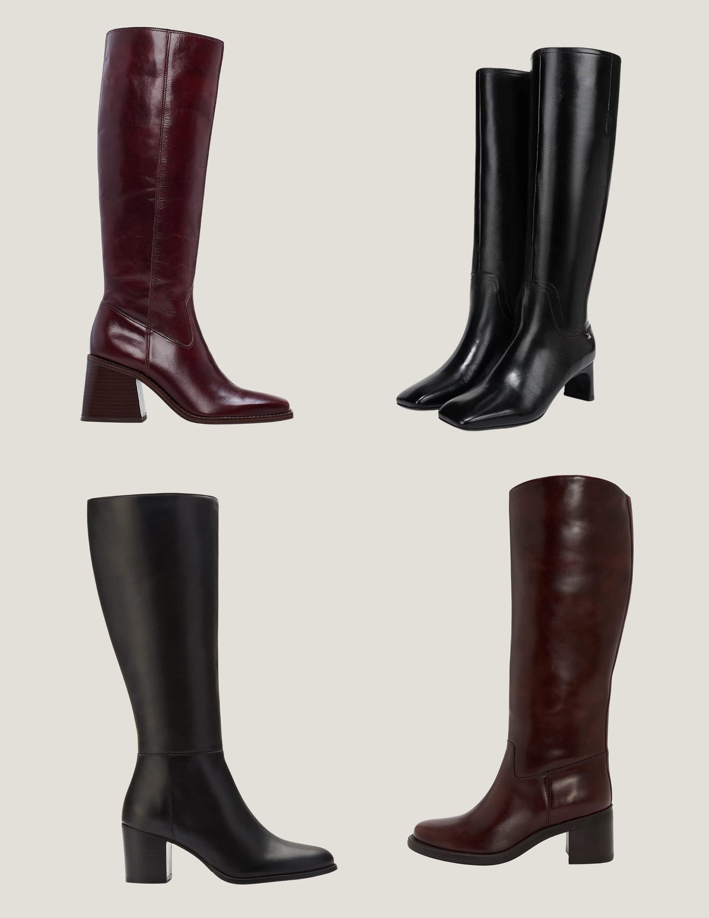 Vince Camuto Sangeti: this recently restocked style comes up often in wide calf boot discussions online. I like the angled block heel and square toe, and am partial to the seasonal burgundy colorway. It comes in four calf sizes, from narrow to extra wide. Here’s a TikTok creator with a try-on video of the wide calf styles in all the colors.