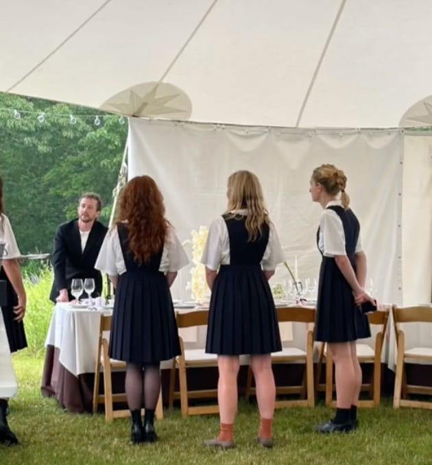 donning signature sandy schoolgirl outfits, the bartenders are serving ironic handsomeness. the footwear looks sensible, the hairstyles seem like what they would normally wear. i really love this twist on the “matching bridesmaids outfit” tradition. it’s unexpected and refreshing.