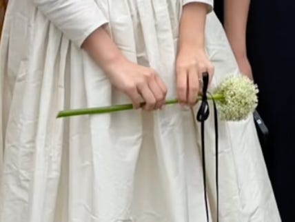 my favorite detail is the single puffy ornamental onion stem (that’s what these alliums are called) with the black ribbon, a brilliant subversion of the typical bridal bouquet. i can’t get over it. sandy is genius for this. i have a planter of these exact onion plants in my yard, and never thought of them in this way. styled as a bridal accessory, the humble allium transforms into a fairy’s magic wand or a sailor moon scepter. the black ribbon also makes it a touch gothic. it is really the perfect choice and so on-brand for sandy.