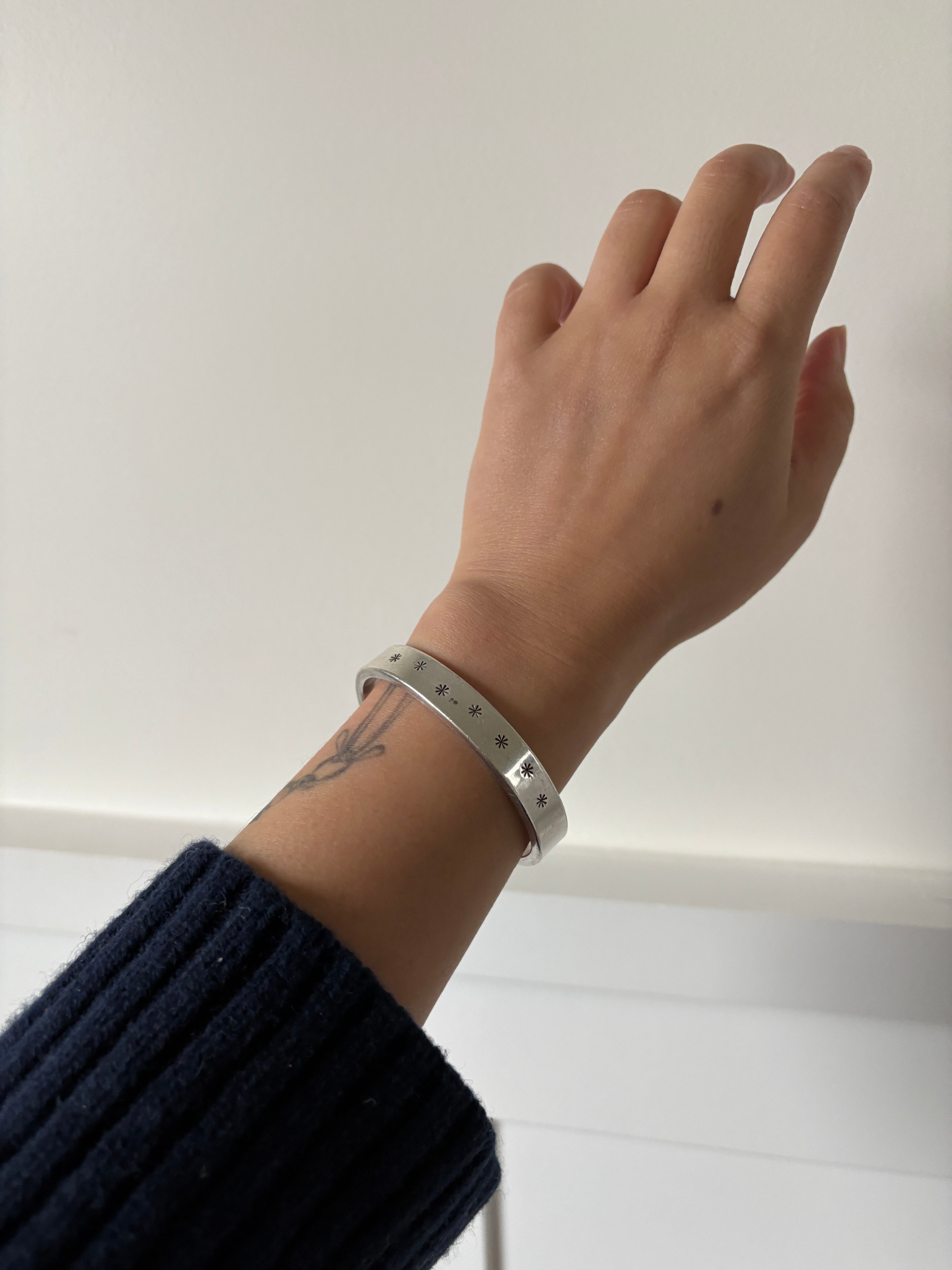 Gosh I must have had this cuff for 3 years…I got it for $80 on eBay and always meant to get it tightened. The tiny abstract star etching makes it feel “me” vs. if it were a plain cuff.