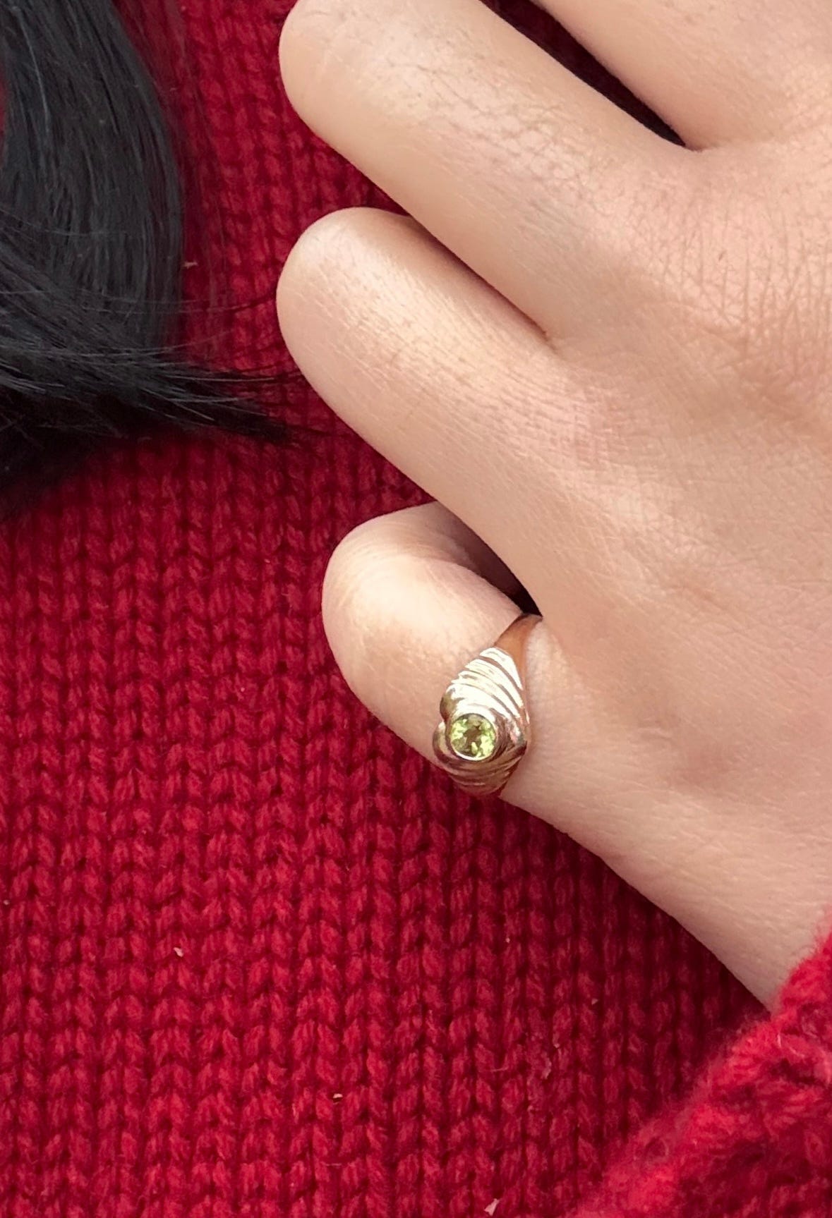This was the most involved alteration. I got the ring sized up, and the jeweler discovered the original peridot was attached by glue and not very secure, so she suggested getting a new peridot inlaid. I was like yes whatever you think is best for the longevity of the item. The original ring was only $50 (!) so even though the additional cost of labor exceeded that, I think it’s worthwhile for such a unique/semi-bespoke design.