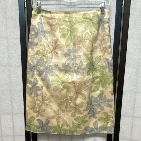 Diane von Furstenberg 100% Silk Leaf Print Skirt —Size 2/4, $43. Picturing this with a green cardigan for something work appropriate. Maybe in this chartreuse shade or a bright melon green.