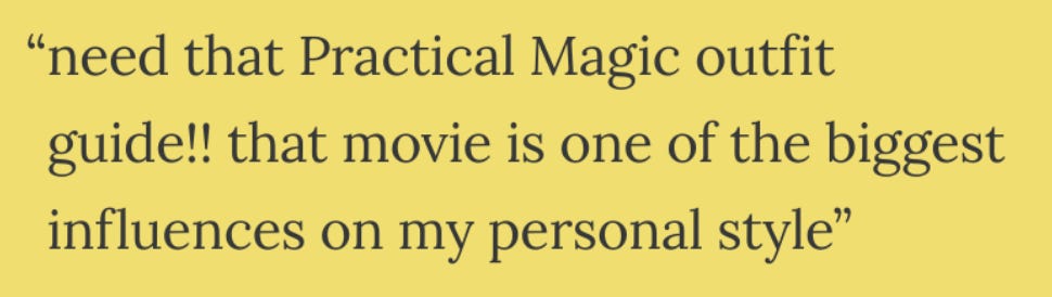 It was in reference to this piece I wrote last October—one of the most beloved Molehill letters to date!—about the cozy, witchy charm of the fictional Owens sisters' outfits.